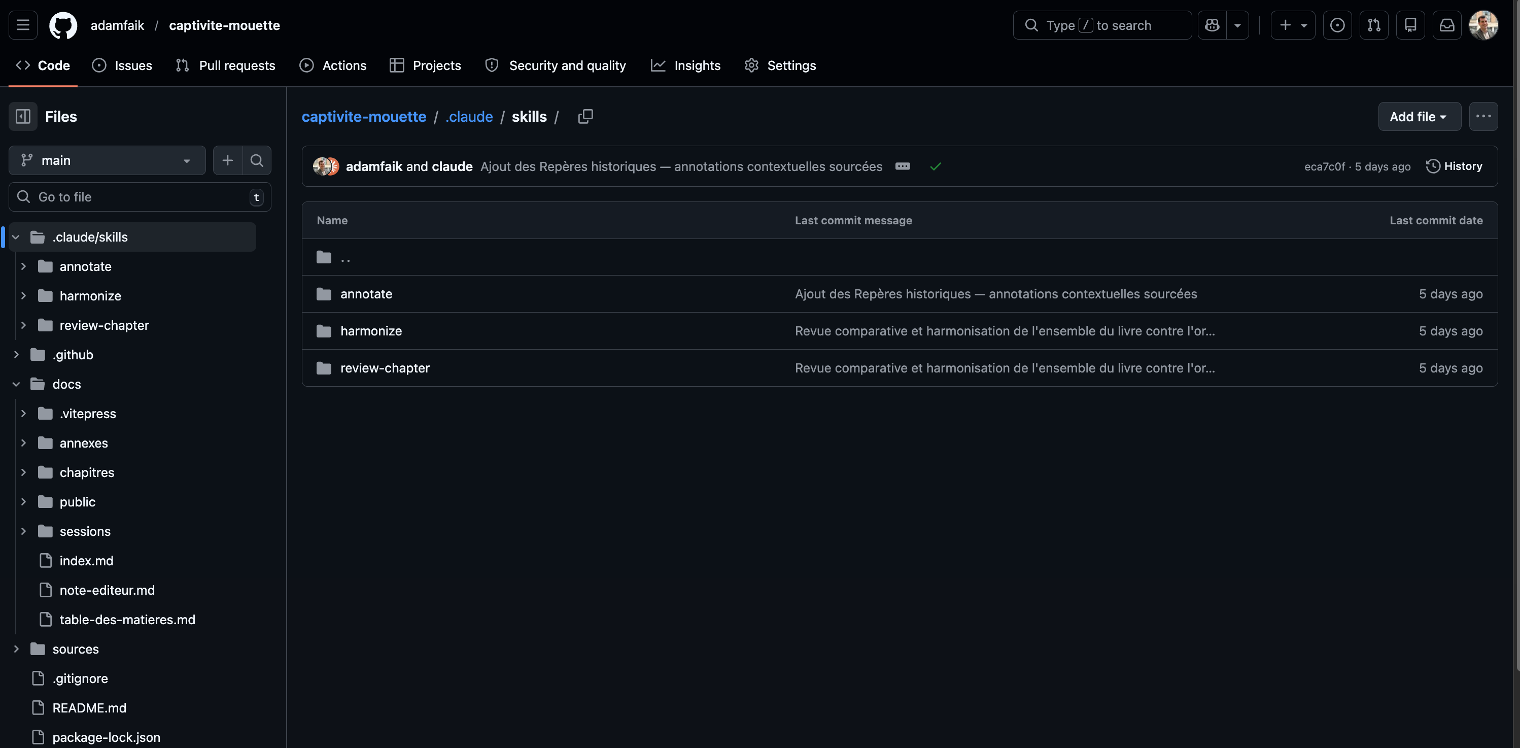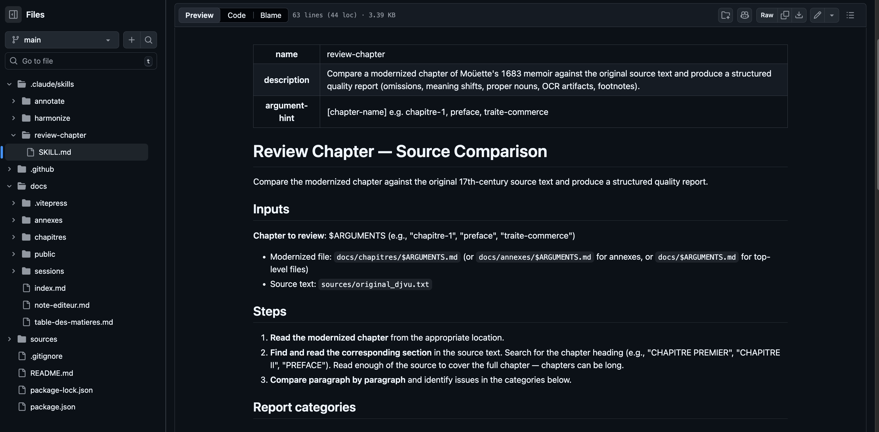 review-chapter: the diagnostic. Reads the modernized chapter, reads the corresponding section of the 1683 source, compares paragraph by paragraph. Produces a structured report across eight categories (A–H): omissions, meaning shifts, unauthorized additions, proper-noun inconsistencies, modernization inconsistencies, OCR artifacts, paragraph structure, footnote candidates. Each issue gets a location, a quoted source passage, a problem statement, and a suggested fix. The report ends with an overall grade: Good / Needs minor fixes / Needs significant rework. Read the full SKILL.md here.harmonize: the rules-applier. Applies all ten editorial rules using the edit tool to touch only what needs touching, never rewriting the whole file. Voice preservation, silent reintegration of omissions, proper-noun normalization, footnote discipline, paragraph-structure rules, sensitive-vocabulary preservation. All embedded in the skill itself. When I run/harmonize chapitre-7, it doesn’t just “modernize” the chapter. It applies the whole editorial policy. Read it here.annotate: the one with the strictest rule. Appends a ”Repères historiques” section to each chapter with five to ten contextual notes. Each note: a brief quote from the chapter, a 3-6 sentence explanation, a cited source. Every factual claim must be verified via WebSearch before it’s written. No exceptions. If the model can’t verify something, the note either gets dropped or explicitly marked as uncertain. Academic sources preferred. The tone target is ”a knowledgeable friend, not a textbook.” Read it here.