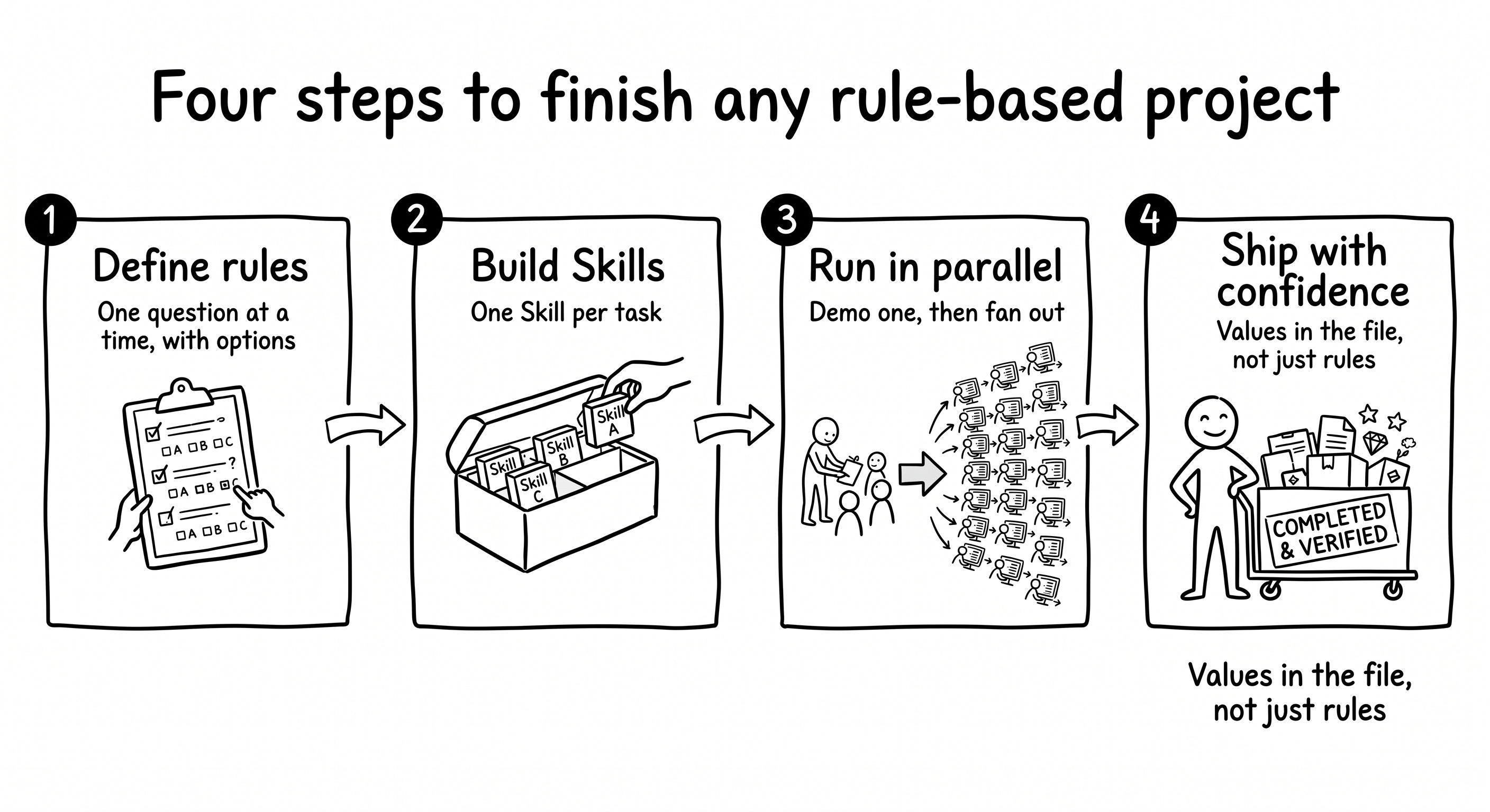 How I finished the book: four steps. Ten editorial rules defined in one morning, three Skills built in sequence, twenty-one chapters run in parallel.
