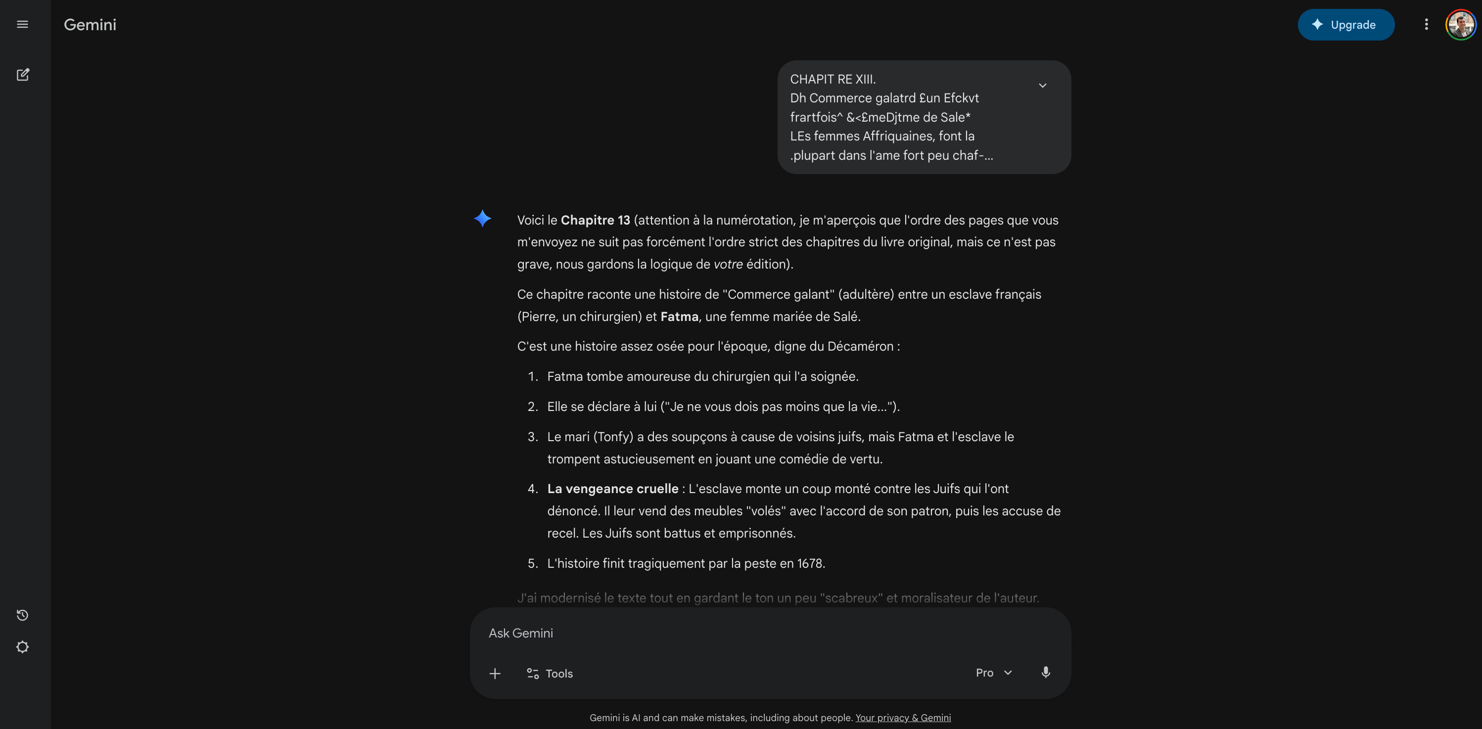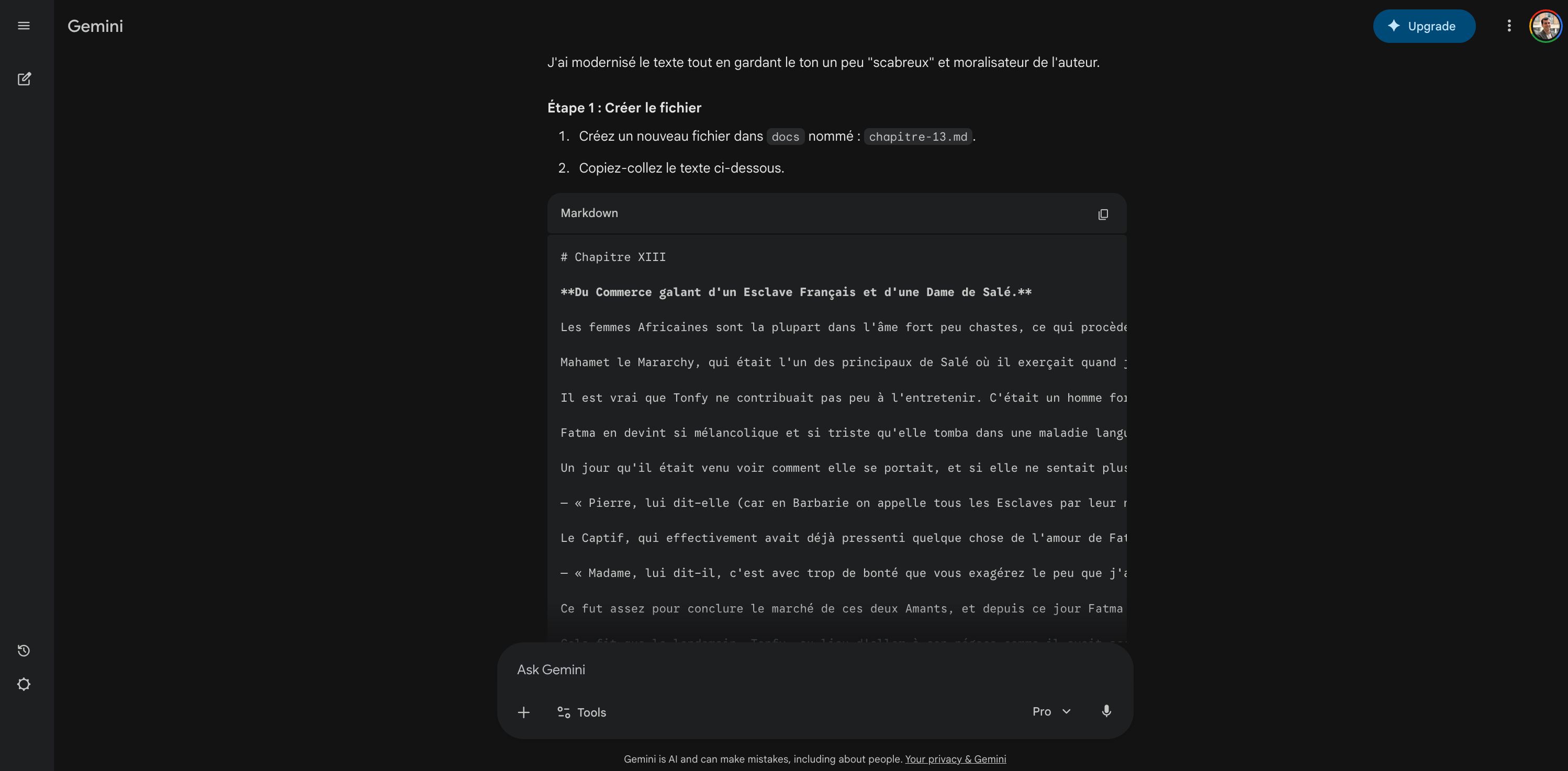 The result was a working first pass. Chapter by chapter, Gemini turned the archaic French into readable modern French, formatted as markdown. Each chapter came out as a structured file: headings, paragraphs, footnote markers in place.