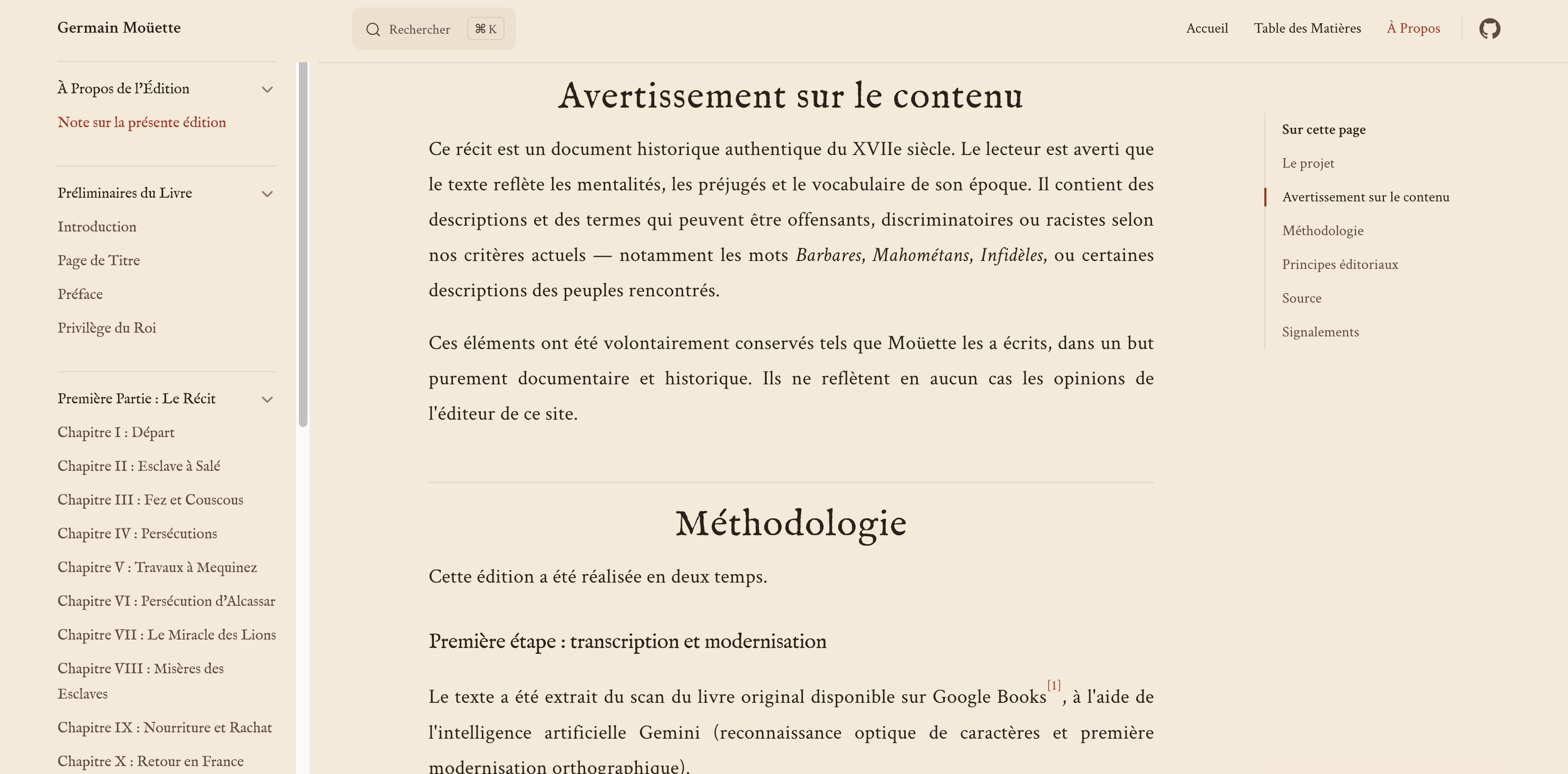 A few weeks ago I published a book online. A French captivity memoir from 1683, modernized and annotated, sitting quietly at adamfaik.github.io/captivite-mouette. You can read it right now, in French, from the first page of the preface to the Arabic-French lexicon at the back. I had told myself I’d finish that book when I retired. I’m still decades away from retirement.