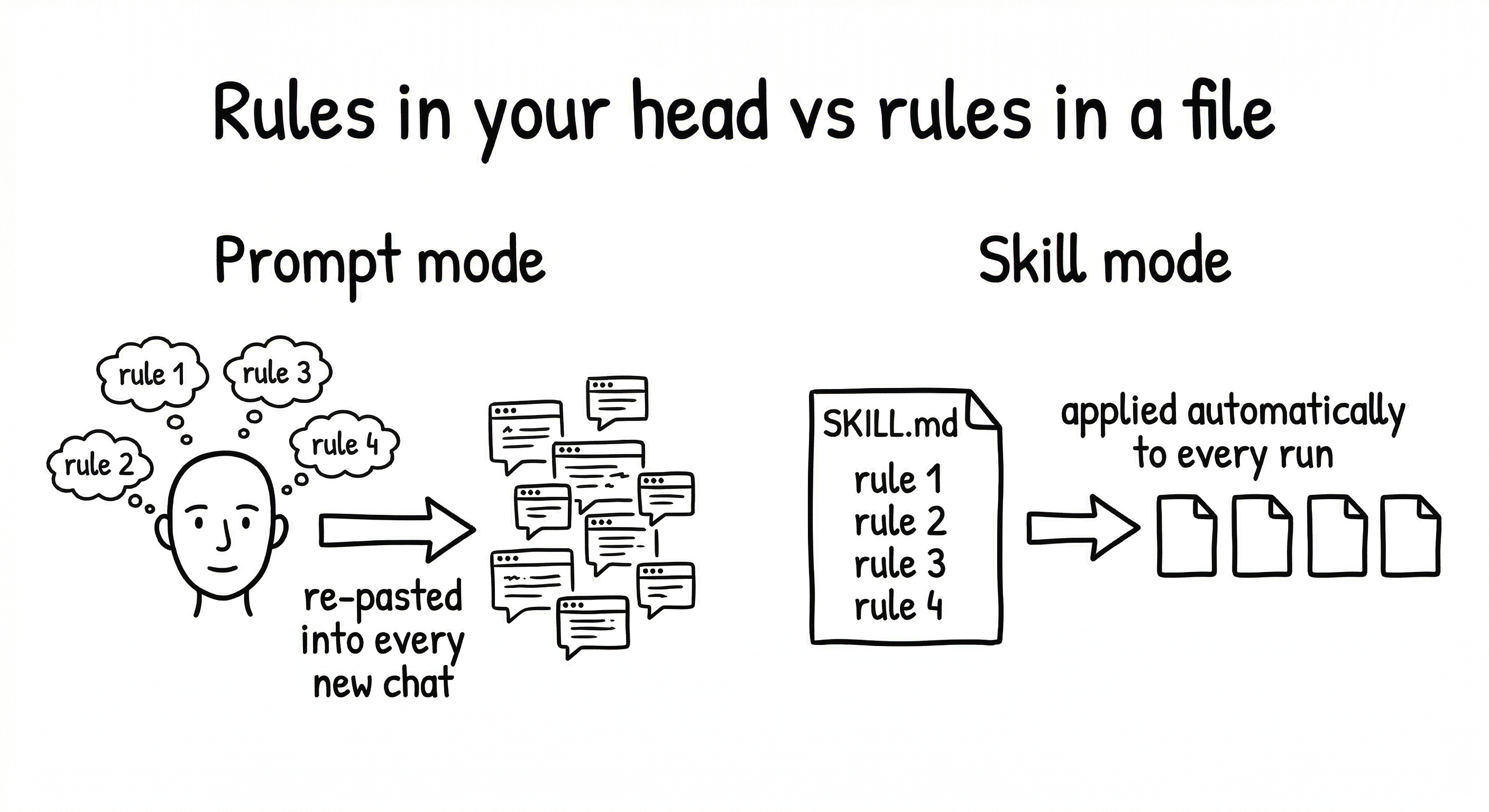 Does the output need to look the same shape every time? Same structure, same tone rules, same format, week after week. That’s the exact shape a skill solves.