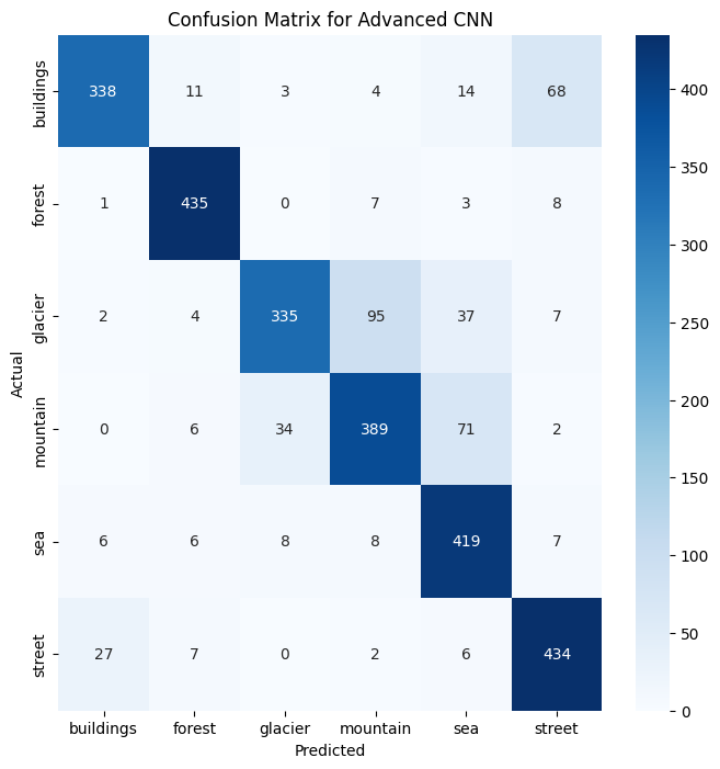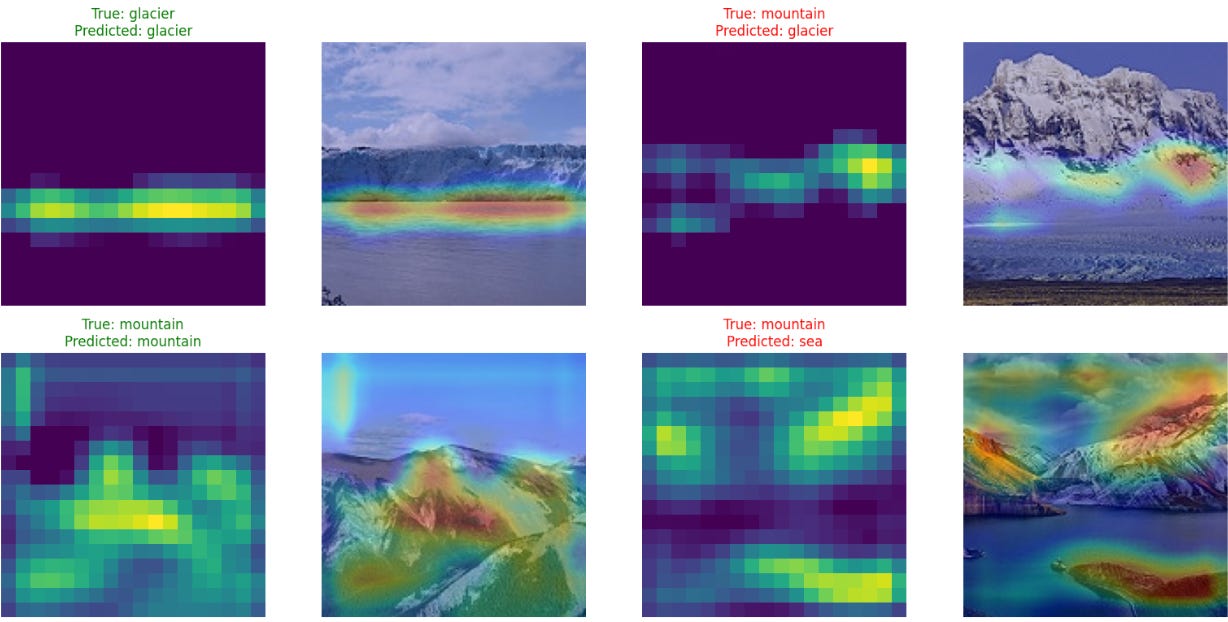 The confusion matrix confirmed the model was great at spotting “forests,” but it put a bright spotlight on our key problem: it misclassified 65 “glacier” images as “mountain” and 52 “mountain” images as “glacier”. The antagonist was real.