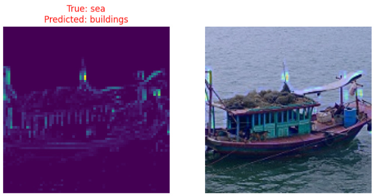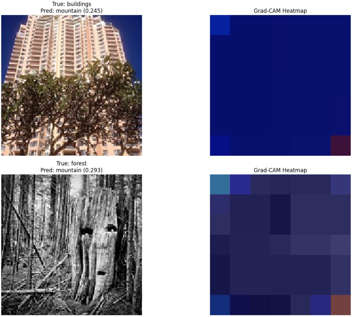 Take the example above. The baseline model looked at an image that was clearly in the ‘sea’ category and incorrectly predicted ‘buildings’. At first, that seems like a bizarre error. But the Grad-CAM heatmap instantly explains the model’s logic. The bright yellow spots show that the model completely ignored the water and the boat, and instead focused its entire attention on the architectural structures in the background. It wasn’t a random guess; it was a logical mistake based on the features it had learned to prioritize.
