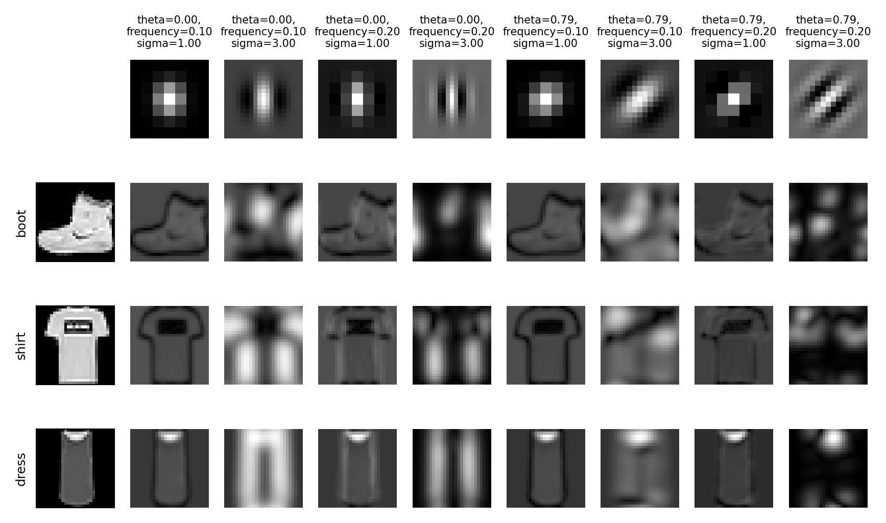 The image below gives a fantastic visual for this. The top row shows what some of these specialized filters or “magnifying glasses” look like, some are designed to find vertical lines, others horizontal blurs, and some even find diagonal textures. The rows below show the result of applying each filter to an image of a boot or a shirt. Notice how each filter highlights a completely different aspect of the original image, creating a unique “feature map” that captures a specific piece of information.