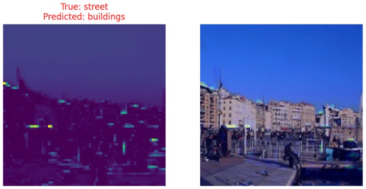 Here’s another one. The model misclassified this “street” scene as “buildings.” Again, the heatmap tells the story. The model’s attention is almost exclusively on the row of building facades, ignoring the street, the people, and the waterfront. This kind of insight is invaluable for a PM because it turns a mysterious error into a concrete product discussion about feature engineering and potential data biases.