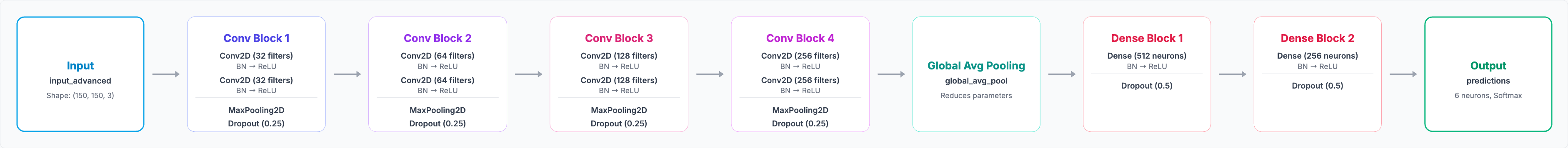 Finally, this highly processed data was fed into the “CEO’s office,” a classification head. A Flatten layer converted the 2D feature maps into a long 1D list, which was then passed through a final Dense layer to make the ultimate prediction for our six categories.