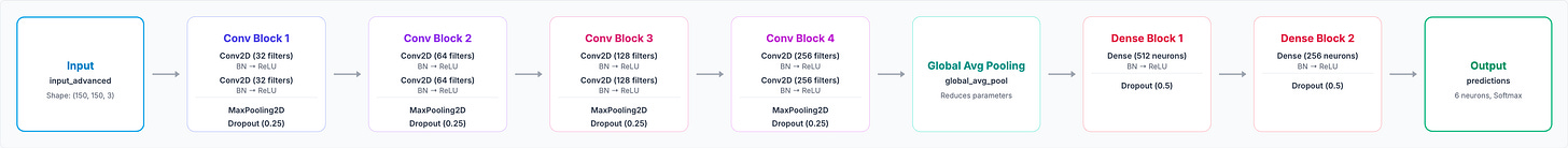 The baseline model was good, but I had a nagging fear of overfitting. Was it truly learning or just memorizing? I built a deeper, four-block CNN and integrated a suite of regularization techniques to help it generalize better.