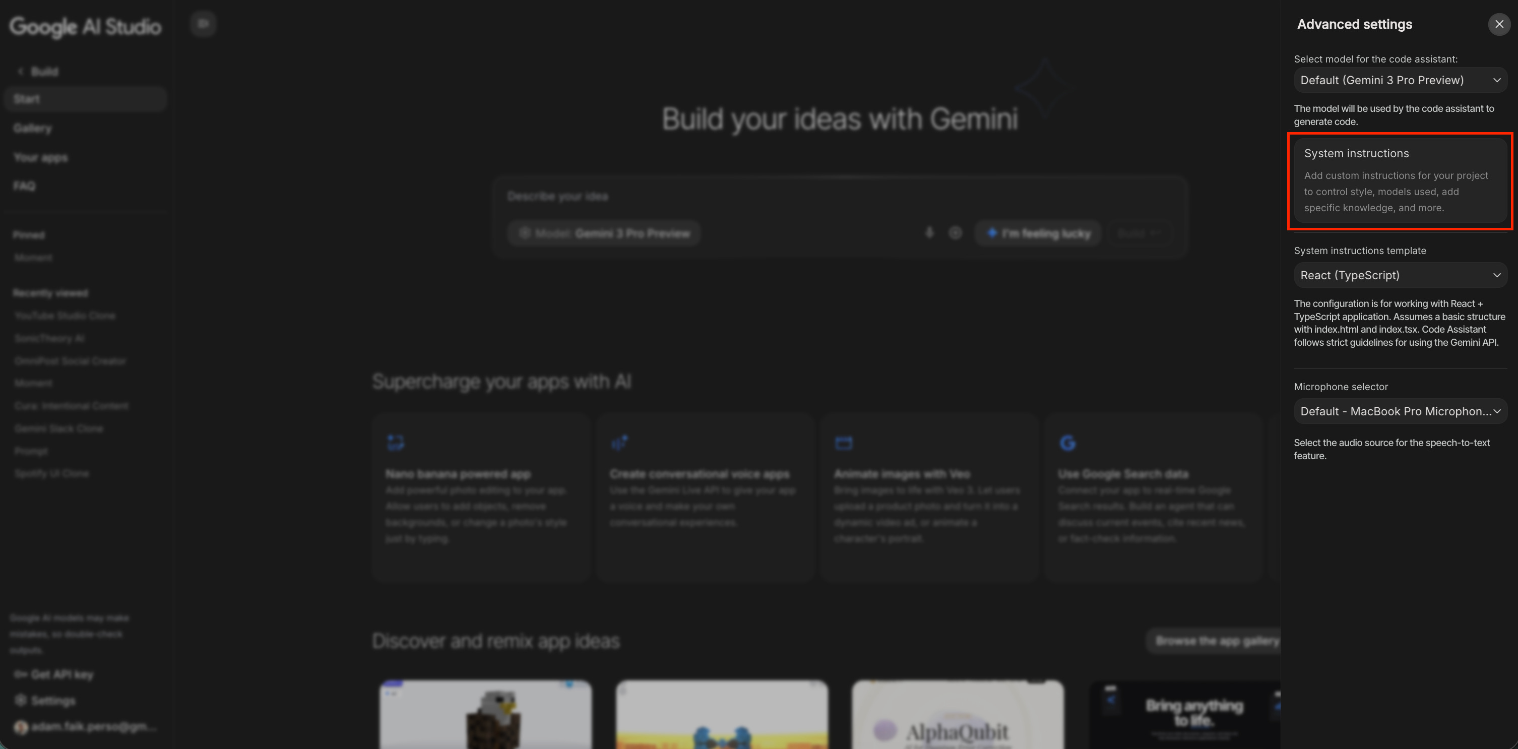 This is critical. While the chat prompt is for action (”Make the button blue”), the system instructions panel is for governance. This is where you define the laws of physics for your app.