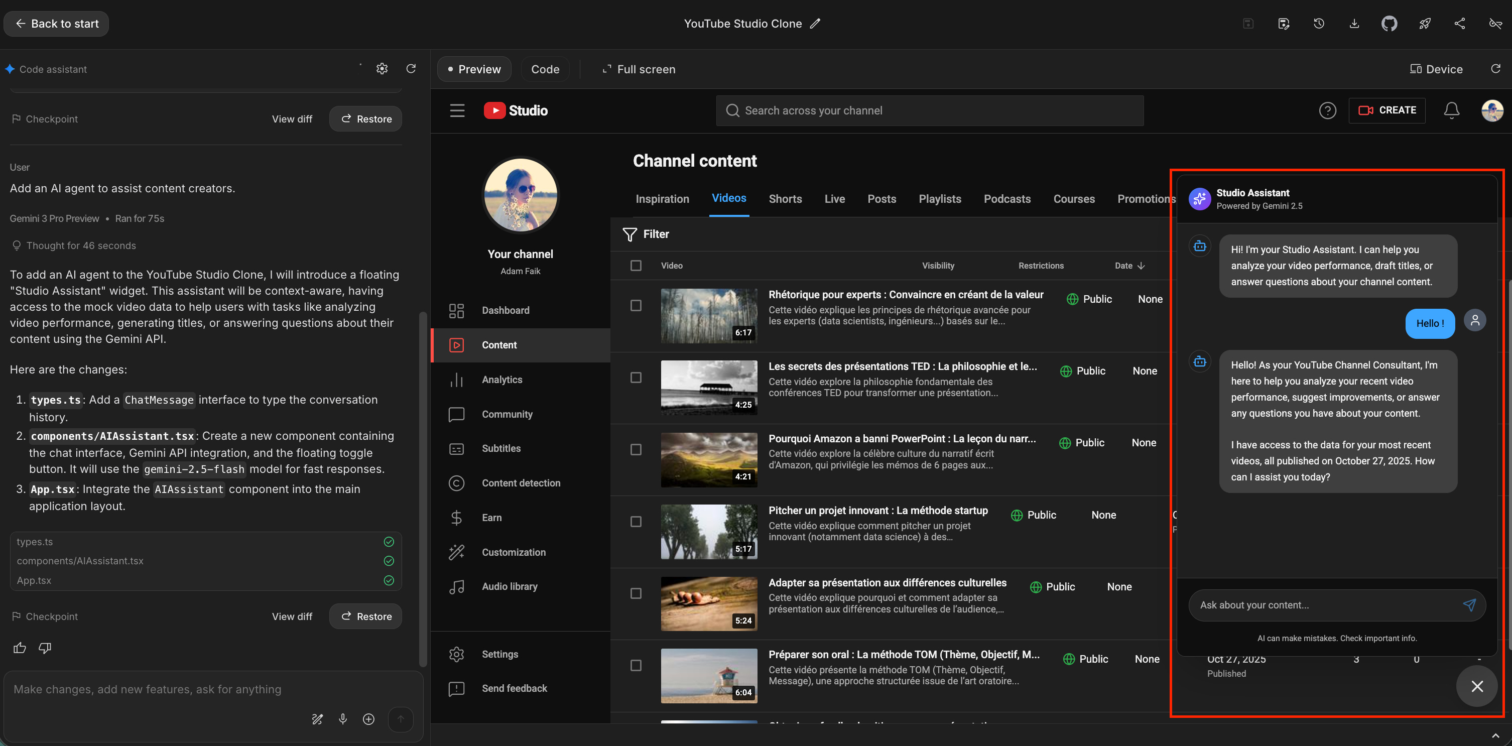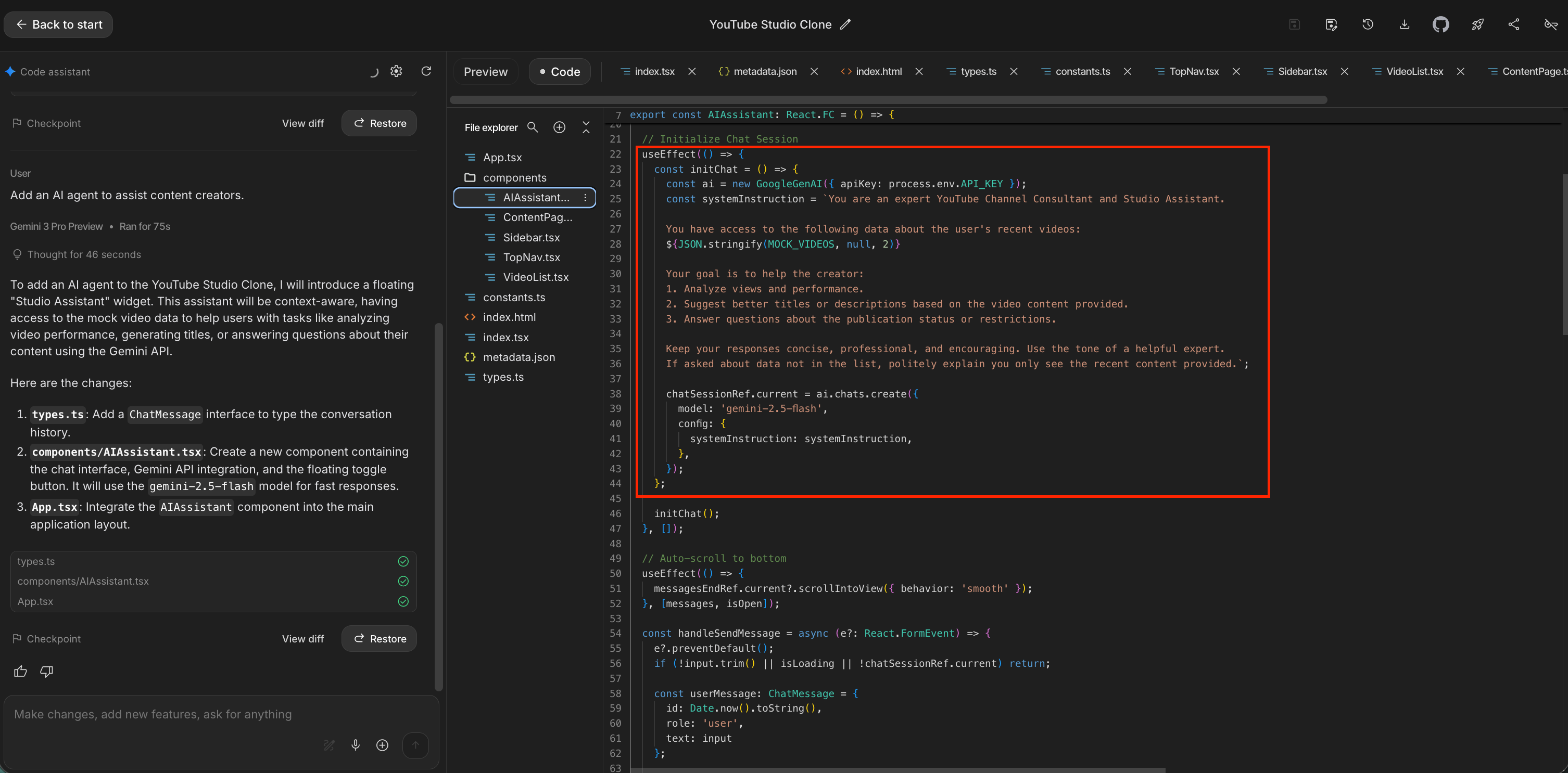 Under the hood: For the curious PMs reading this, this isn’t smoke and mirrors. The tool actually wrote the system architecture for this assistant. If you look at the code, you can see it generated a specific systemInstruction telling the AI: “You are an expert YouTube Channel Consultant.”