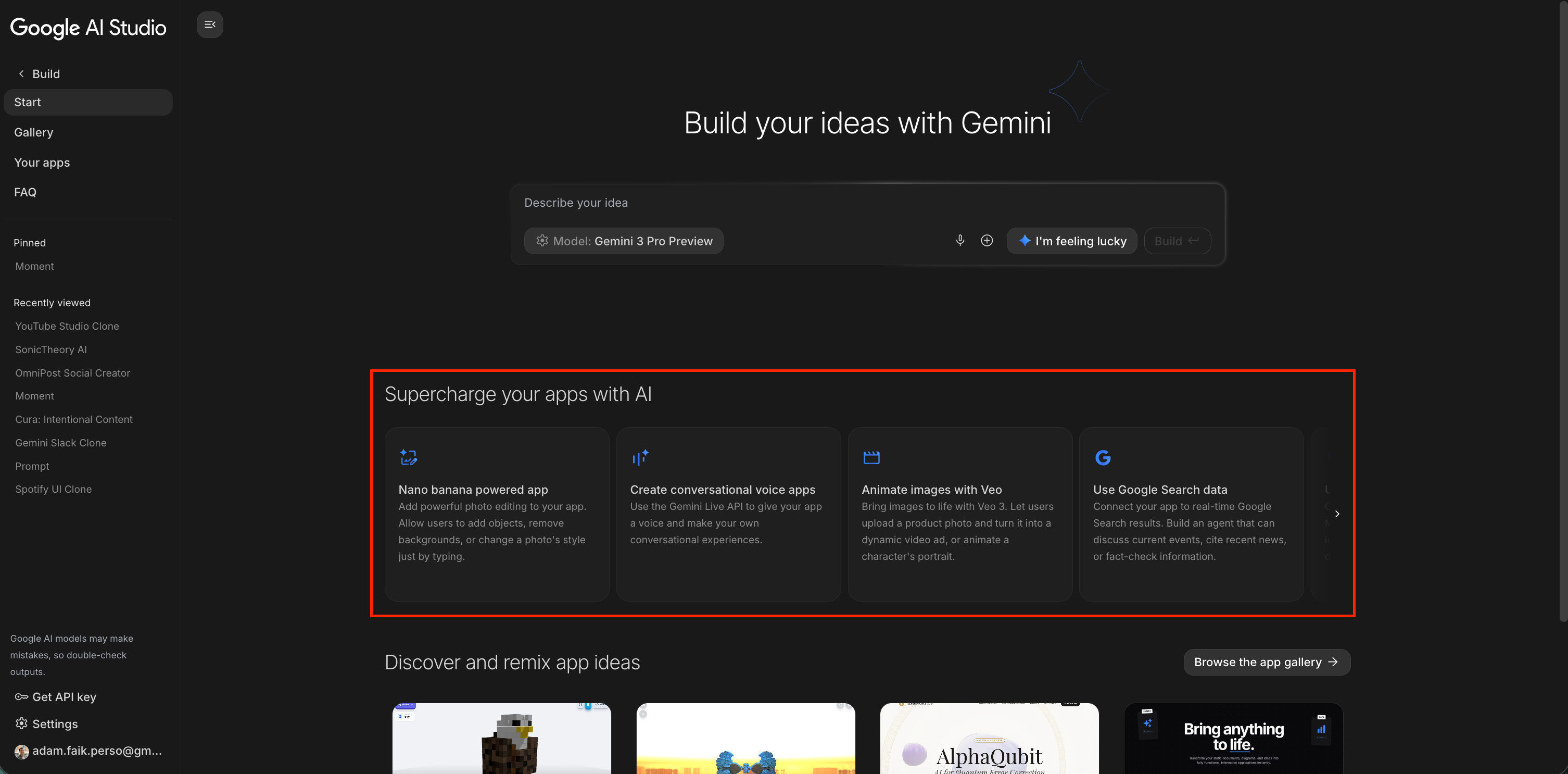 Pro Tip: Look just below the prompt bar. Google lists specific “AI Superpowers” (like Vision, Audio, or Google Search). Clicking one of these cards pre-loads the model with the right capabilities for your idea.