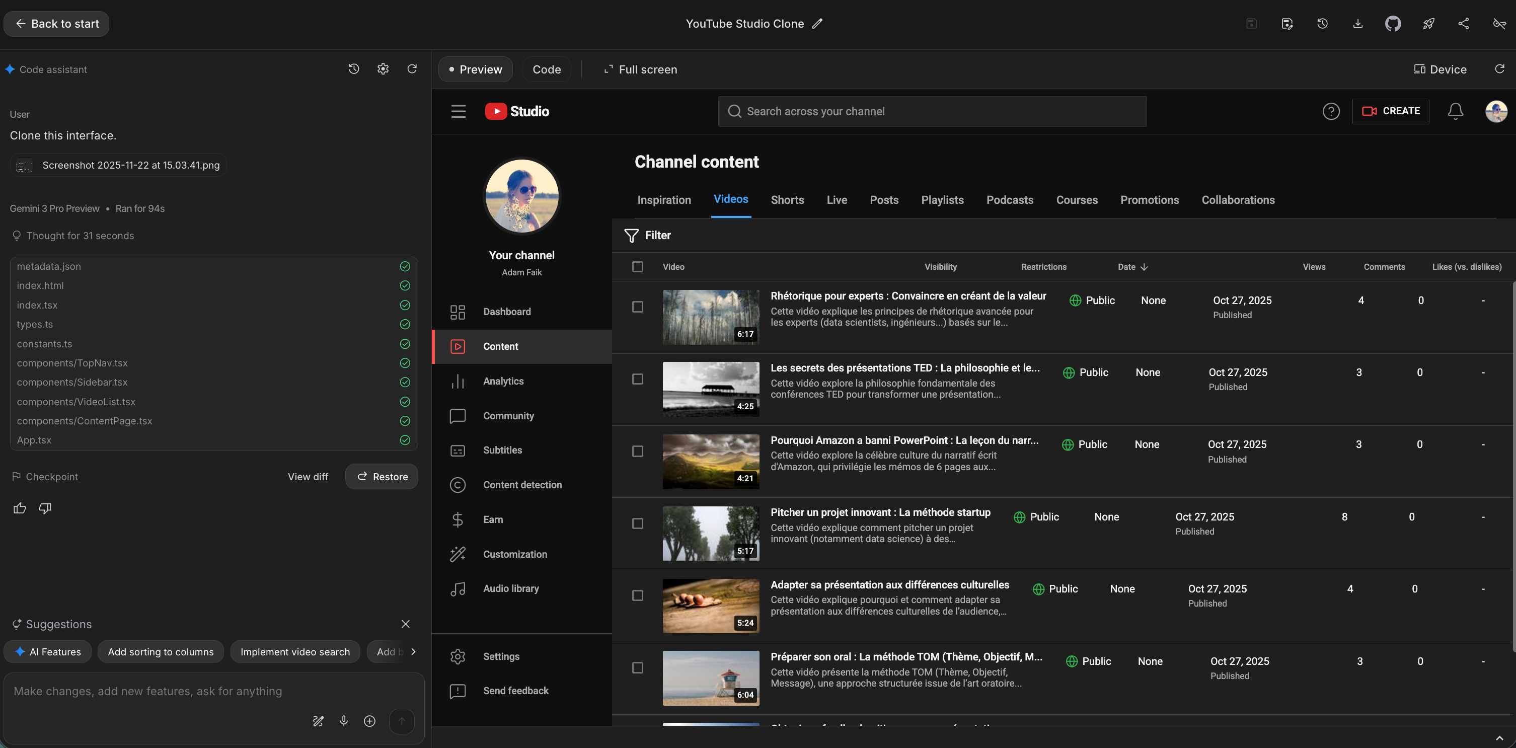 A funny detail: It knows what you need. Here is something that genuinely surprised me. Once the clone was ready, I looked at the “Suggestions” bar at the bottom. The tool had analyzed the context of my dashboard (views, videos, dates) and was already suggesting relevant AI features to add, like “Add date filter,” “Add video search,” or even generic “AI Features.”