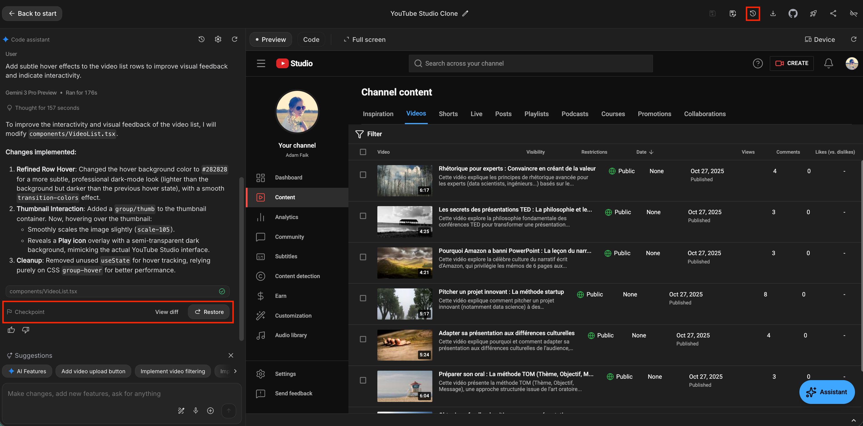 As you build, you will inevitably hit a dead end. Maybe you asked for a new feature, and the AI rewrote your entire working code into a mess. You don’t have to accept the result. Use the Checkpoint feature to travel back in time. It allows you to revert your app to the exact state it was in before that bad prompt, so you can try again with a different approach.