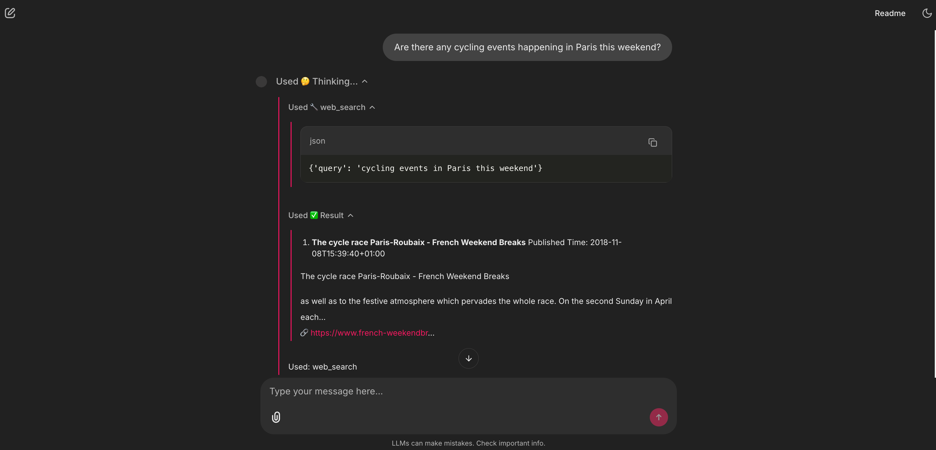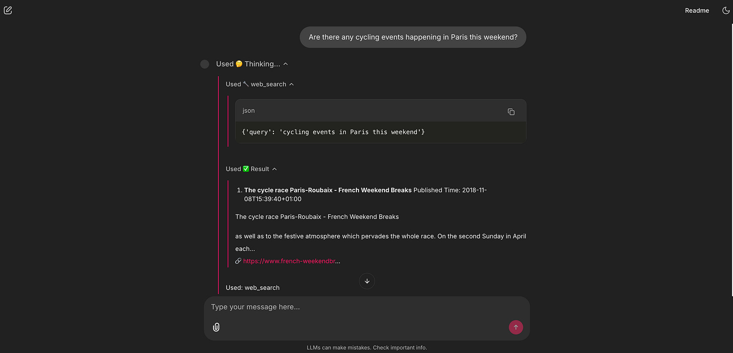 This is the agent’s safety net. My RAG library knows about routes, but it can’t know about an event happening this weekend. The agent’s reasoning (which we’ll see is defined in the System Prompt) is: “I’ll check my paris_bike_guide tool first. No results? Okay, this must be a current event. I’ll use the web_search tool instead.” This two-step fallback is a sophisticated piece of product logic.