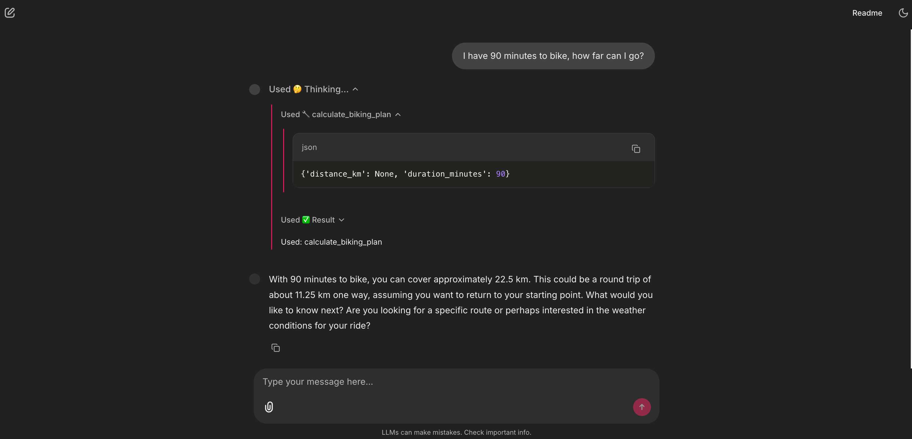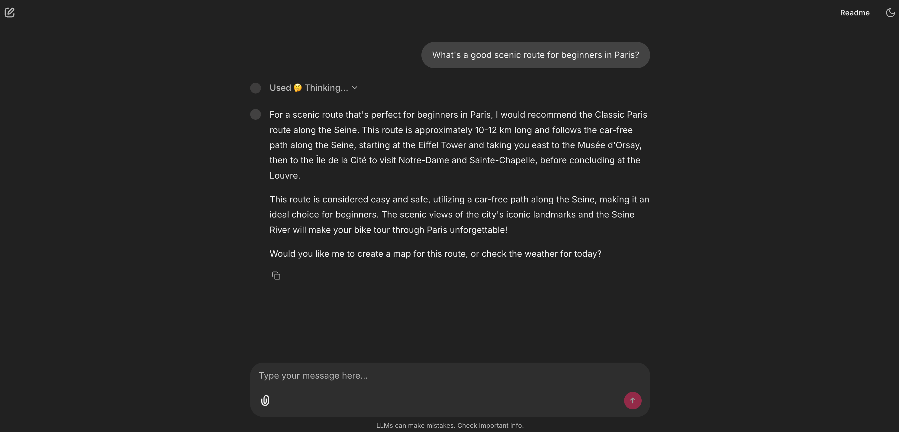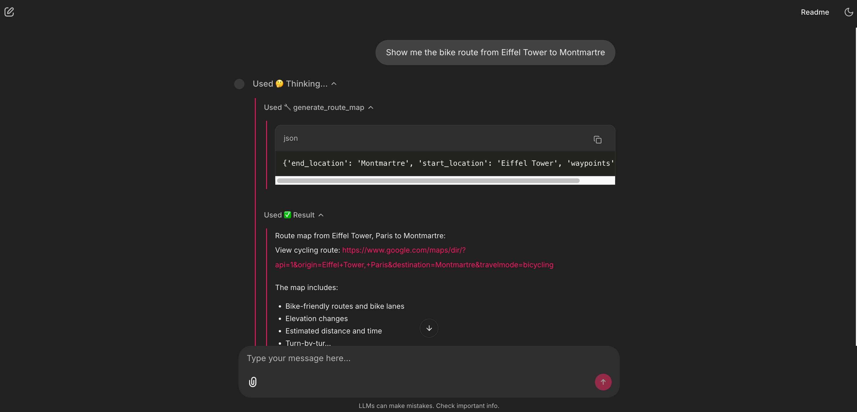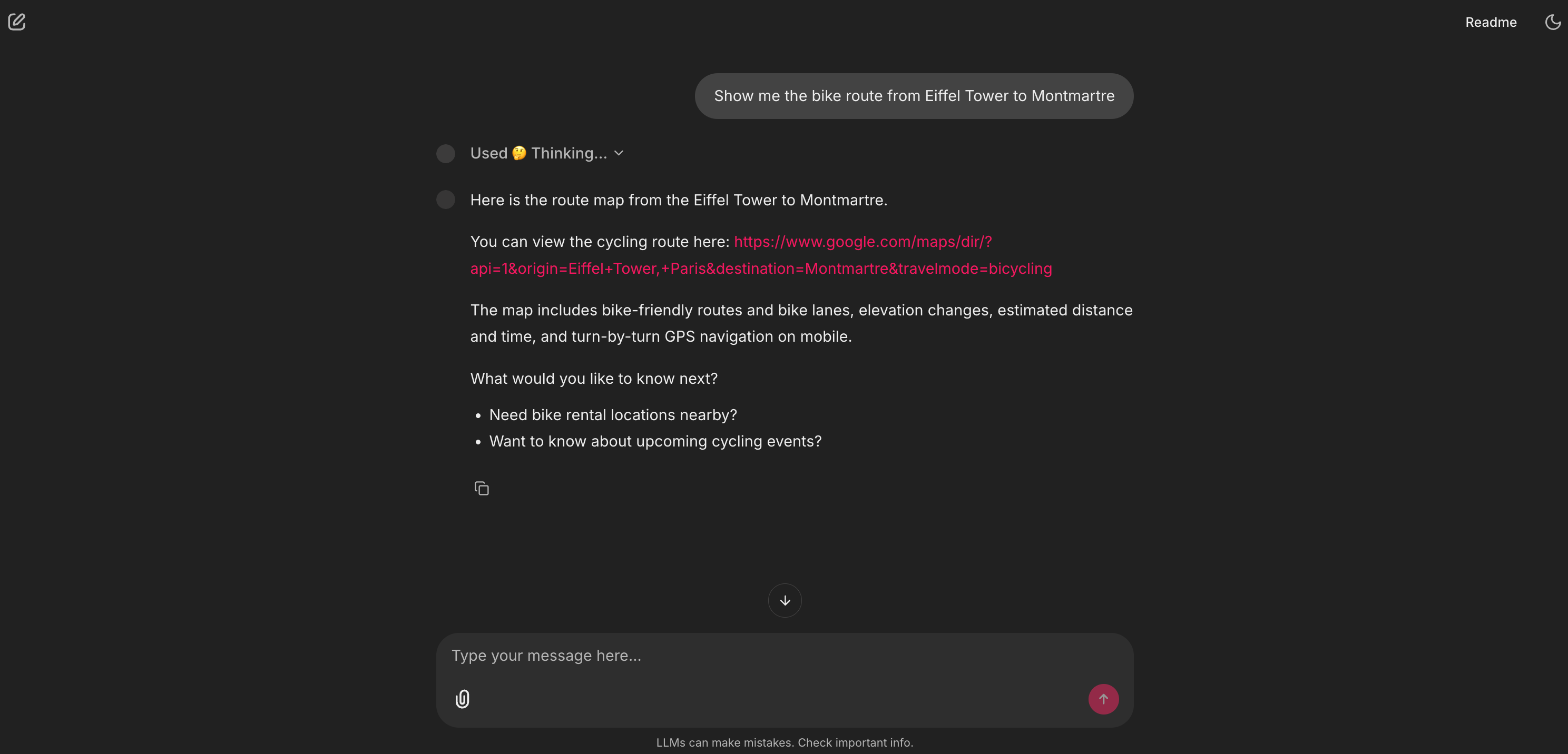 Testing: I created a formal test suite: 5 questions for each of the 5 tools (”What’s the weather?”), plus 10 complex multi-tool questions (”Plan a 2-hour ride for beginners from the Louvre, but only if it’s not raining.”).