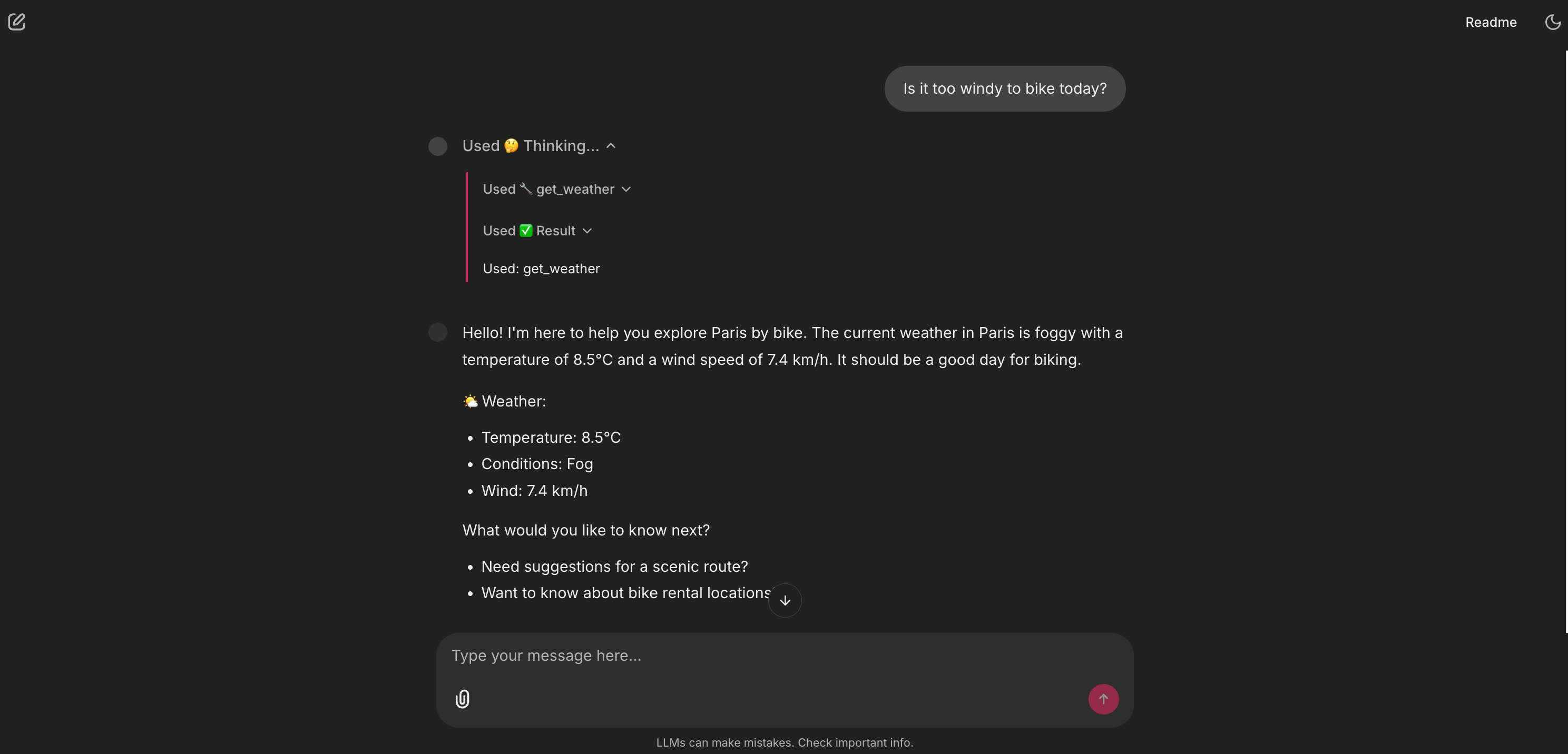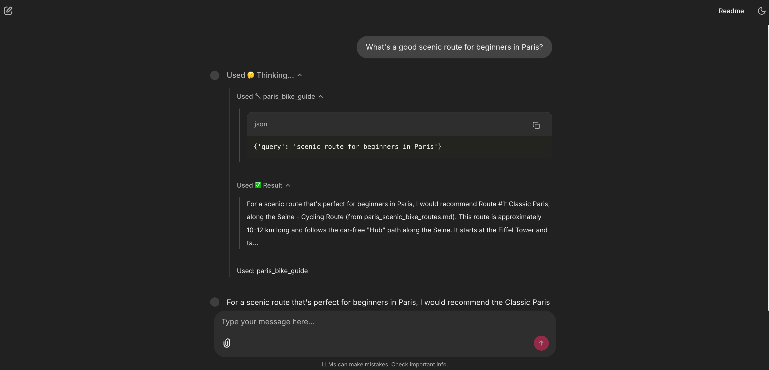 SYSTEM_PROMPTto be more inclined to use theparis_bike_guidetool first.” We iterated until the logic was sharp.