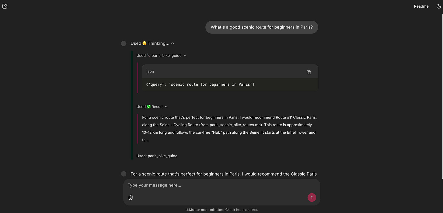 This is our Retrieval-Augmented Generation (RAG) pipeline in action. The agent didn’t Google a generic answer. It correctly identified this as a knowledge-base question and called its paris_bike_guide tool. The UI shows it thinking and selecting that specific tool. The answer it gives is high-quality, expert-level, and citable (it comes from paris_scenic_bike_routes.md) because I curated the data it’s pulling from.