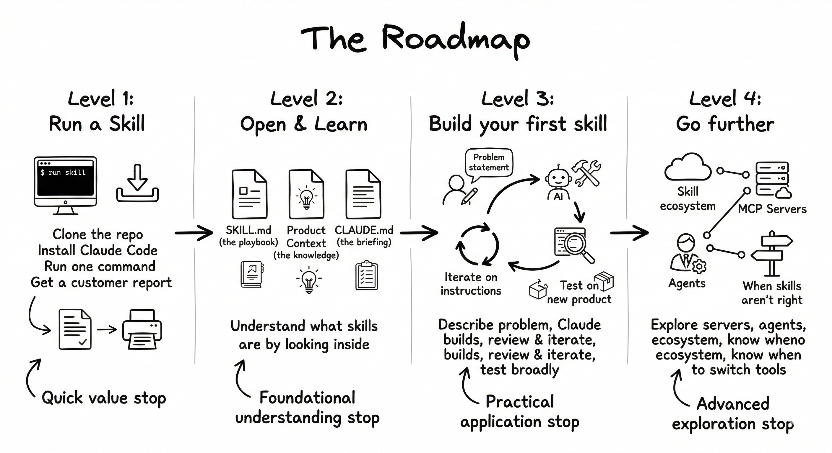 Level 2: Understand what skills are. Open the skill files and learn the building blocks: SKILL.md, product context, CLAUDE.md. See how skills compare to custom GPTs, NotebookLM, and saved prompts.