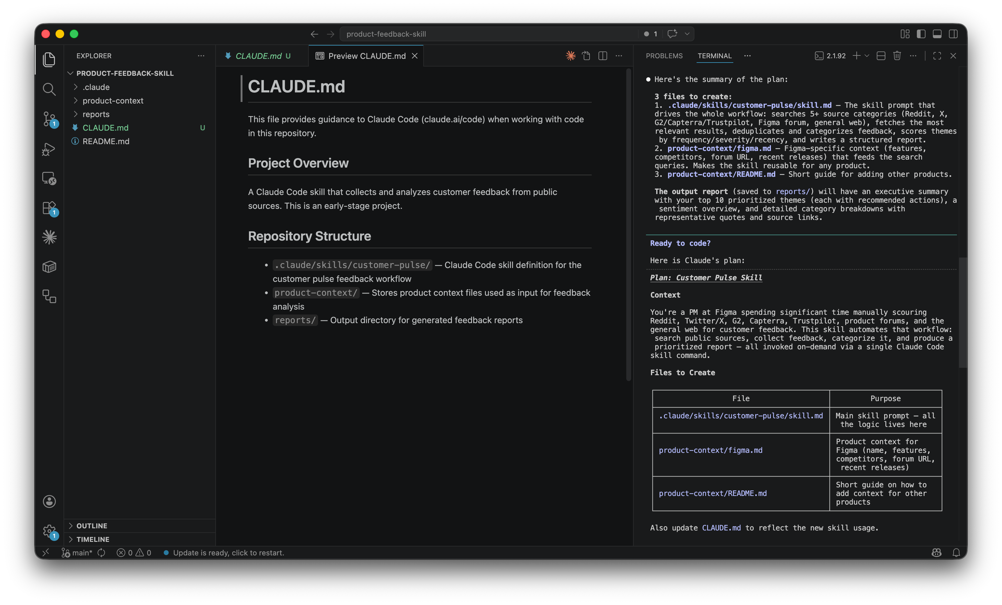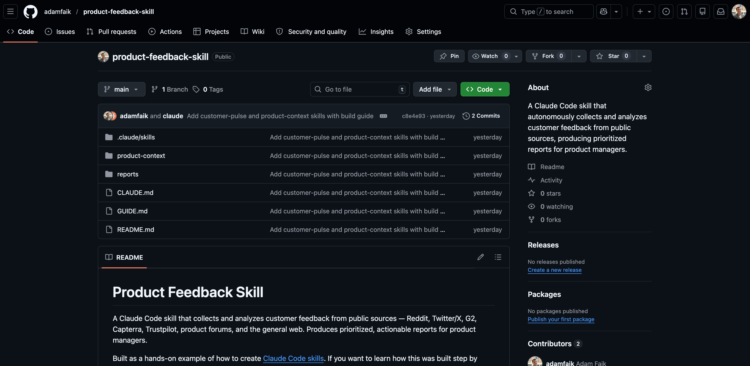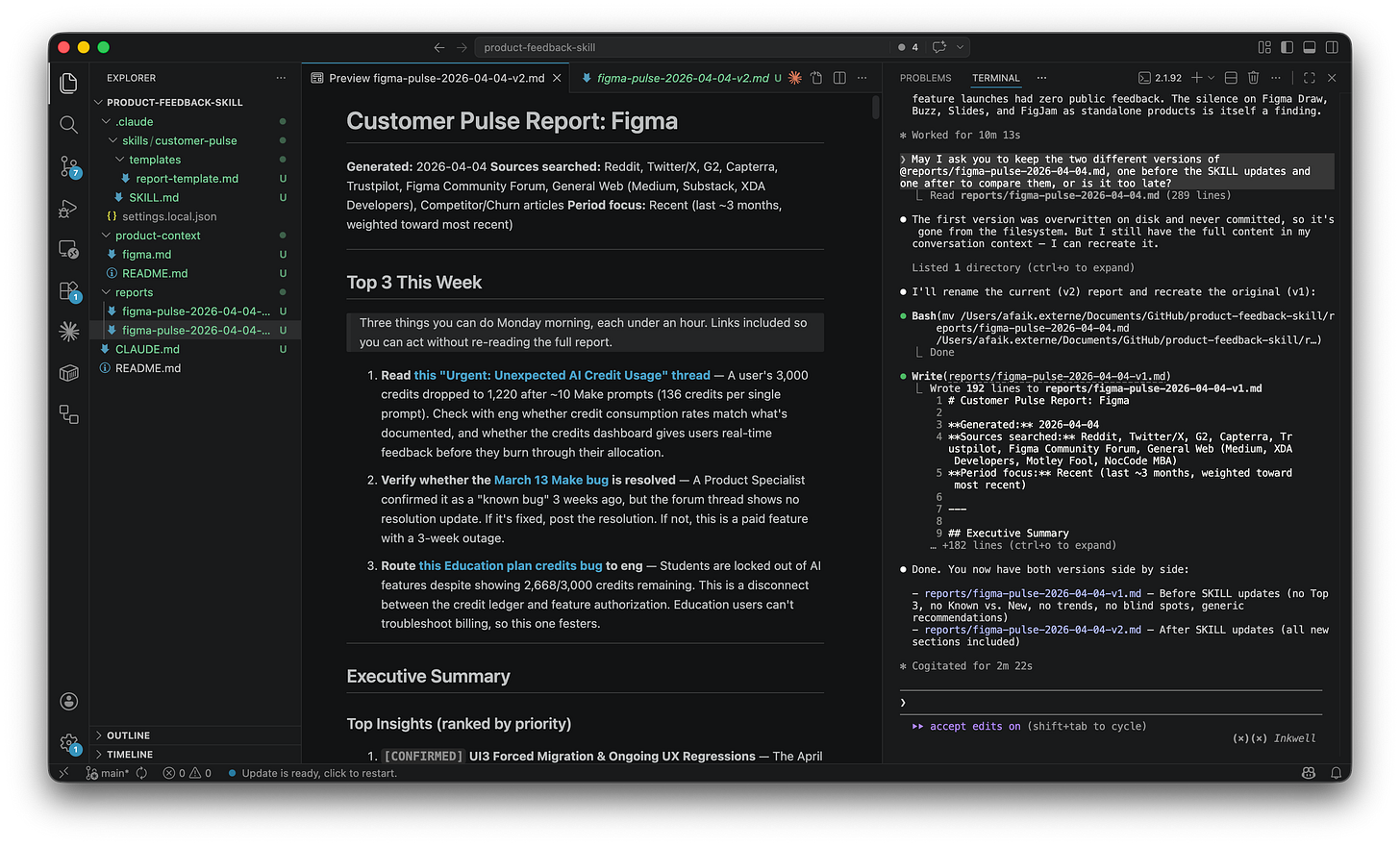 The skill I built is called /customer-pulse. It searches the web for what real users are saying about a product (app store reviews, Trustpilot, forums, comparison articles, etc.), then produces a structured report with ranked themes, real quotes, blind spots, and concrete actions. Everything I built is in this GitHub repo. Clone it, explore it, use it for your own product.
