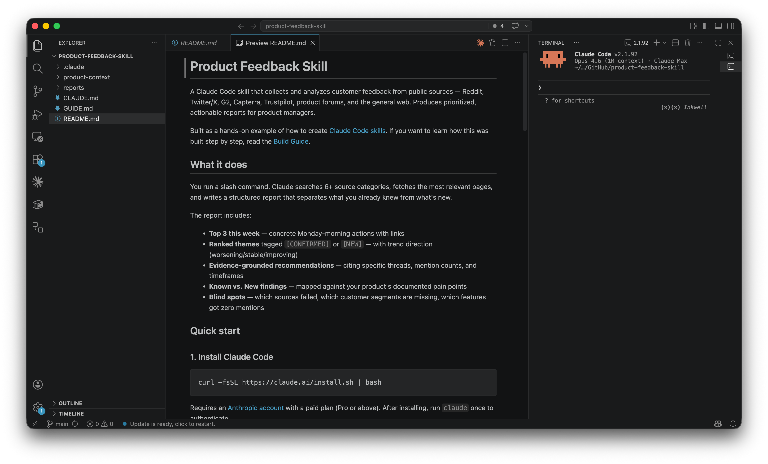 Now in your editor, go to File → Open Folder, navigate to product-feedback-skill, and click Open. The left sidebar (the explorer) shows all the project files.