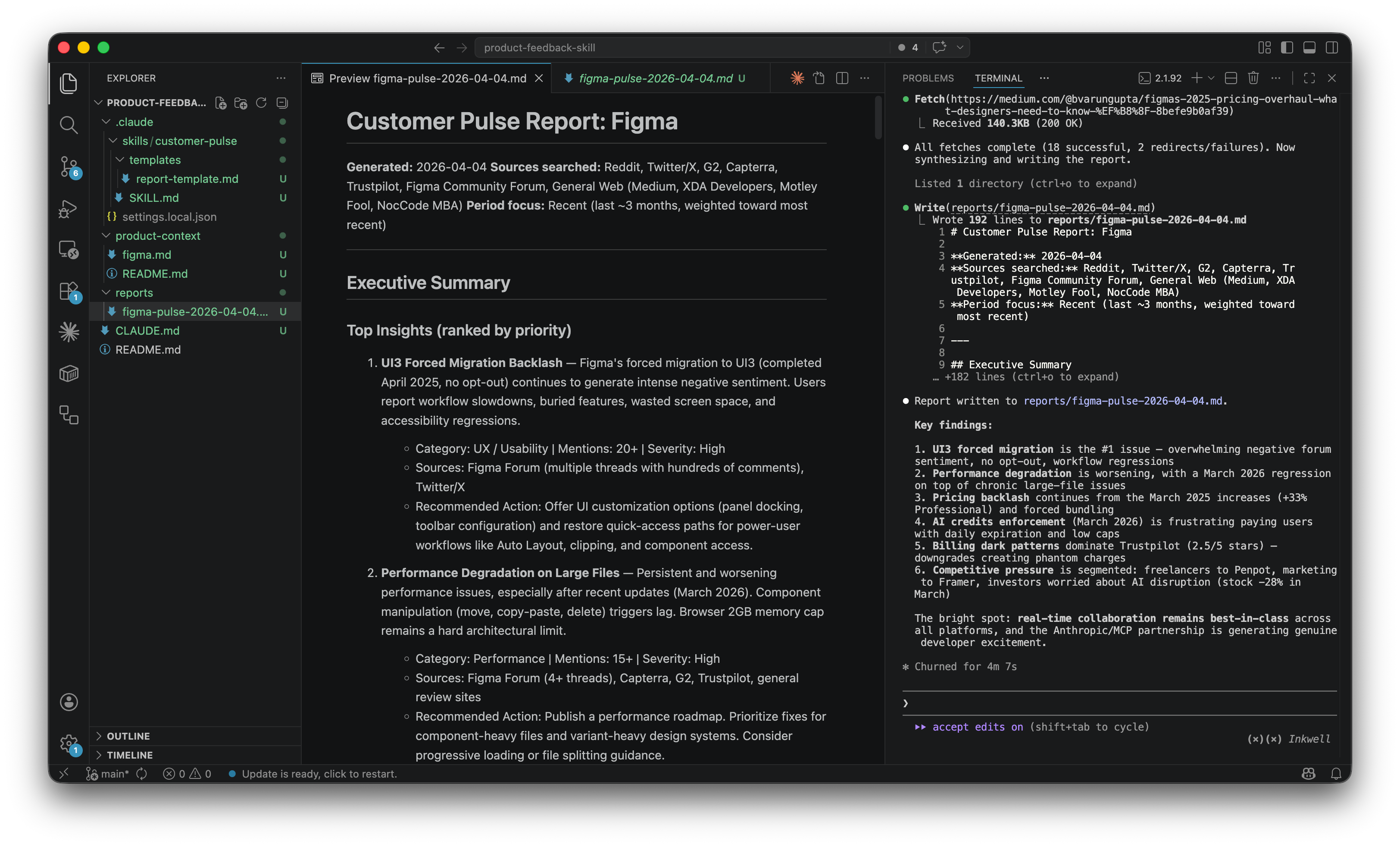 /customer-pulse figmaAnd then just watch. It’s genuinely fun to see. Claude reads the Figma product context, starts searching the web (Trustpilot reviews, forum threads, comparison articles), fetches the most relevant pages, extracts real user quotes, groups them into themes, scores each by severity, and writes a full report to reports/. The whole thing takes a few minutes because Claude is making 12 web searches and fetching up to 20 pages. Just let it do its thing.