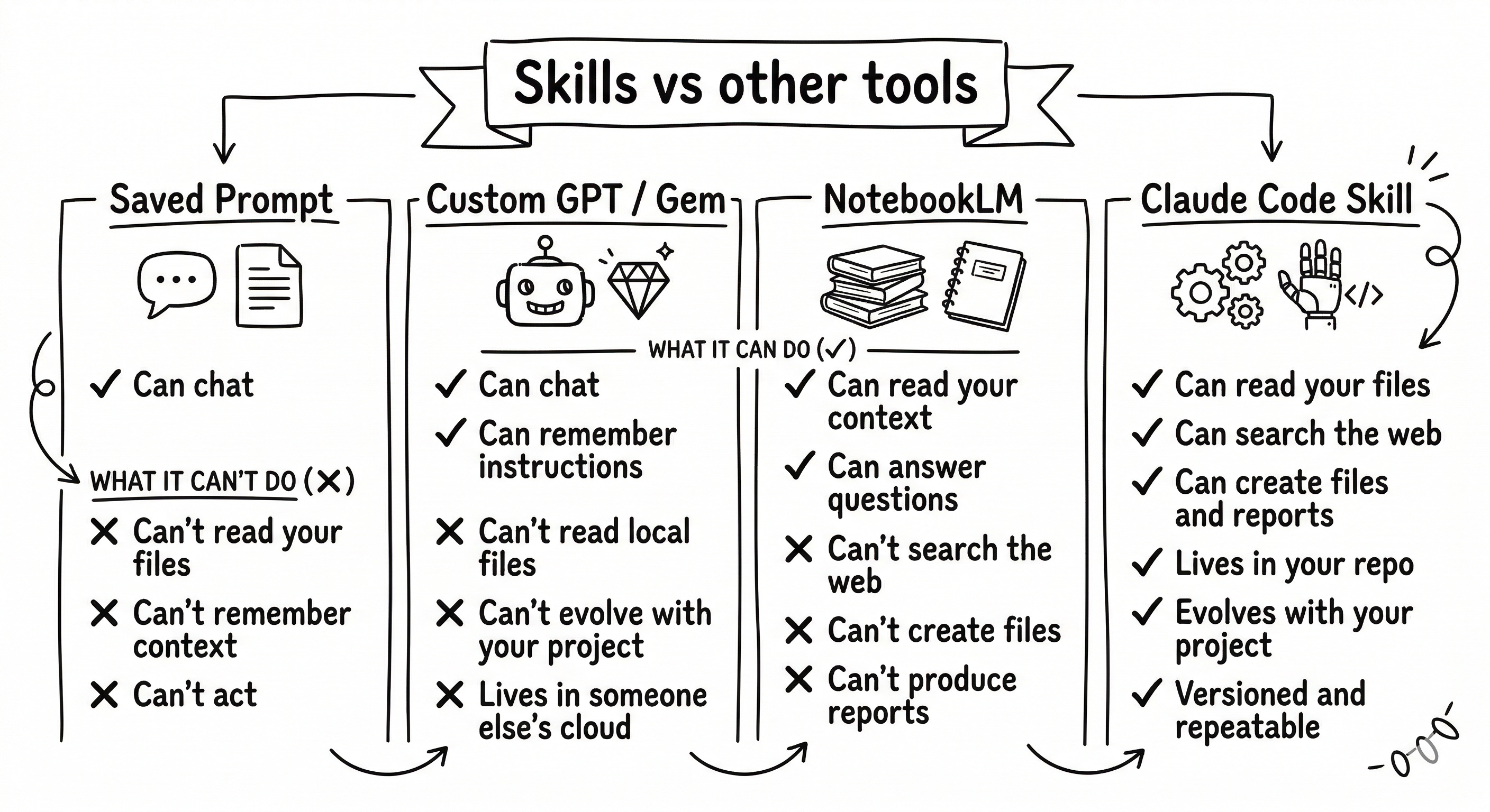 A custom GPT or Gem. Lives in someone else’s cloud. Can’t read your local files. Can’t create documents in your repo. A skill is a Markdown file you own, version-controlled with git.