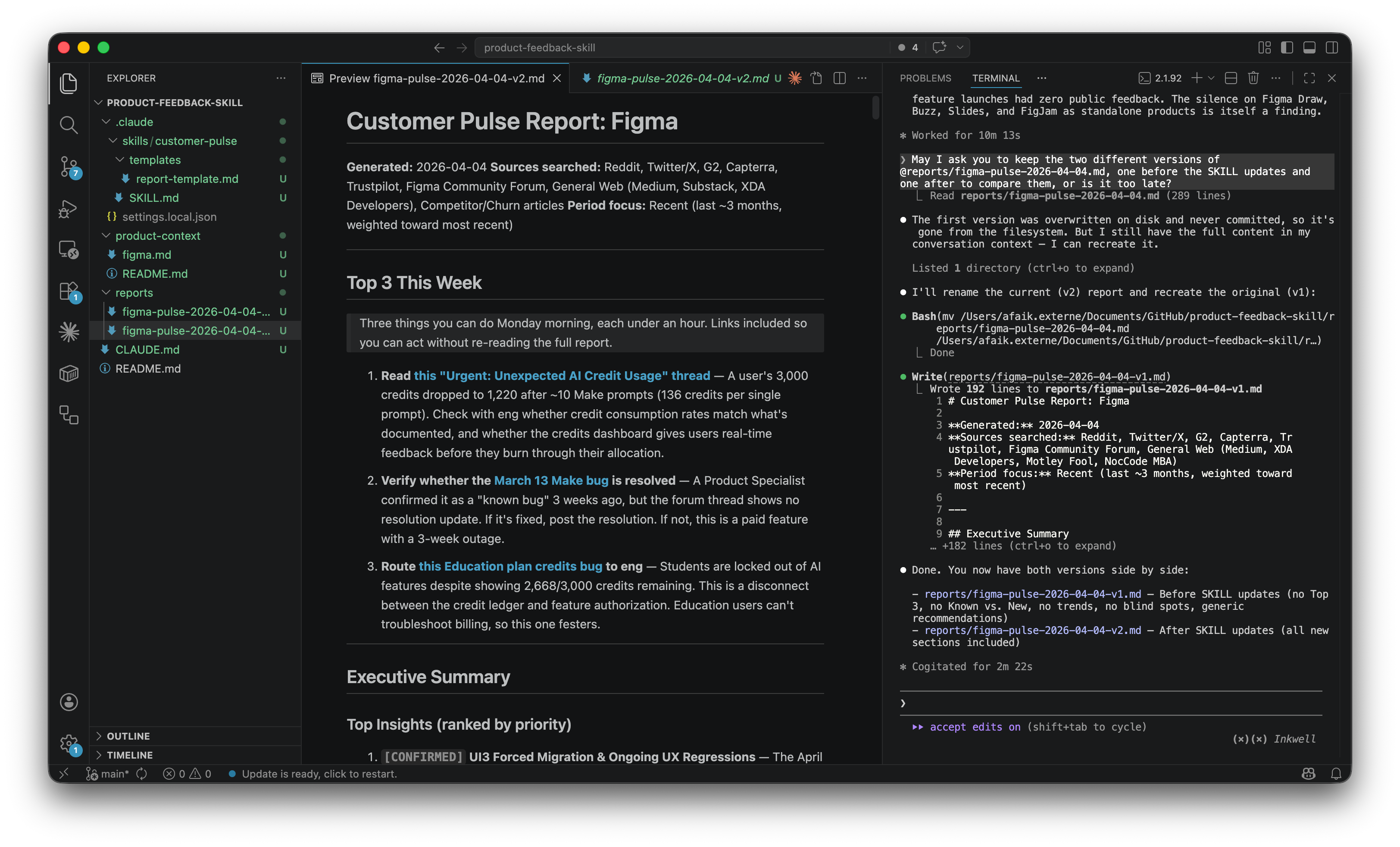 This file describes Figma: features, customer segments, pricing, known pain points, competitors. The skill reads it before searching. That’s why the report isn’t generic. Without product context, you get “users complain about performance.” With it, you get “the March 2026 regression affected component manipulation specifically, compounding the long-standing 2GB memory cap issue that hits enterprise teams with variant-heavy design systems.”
