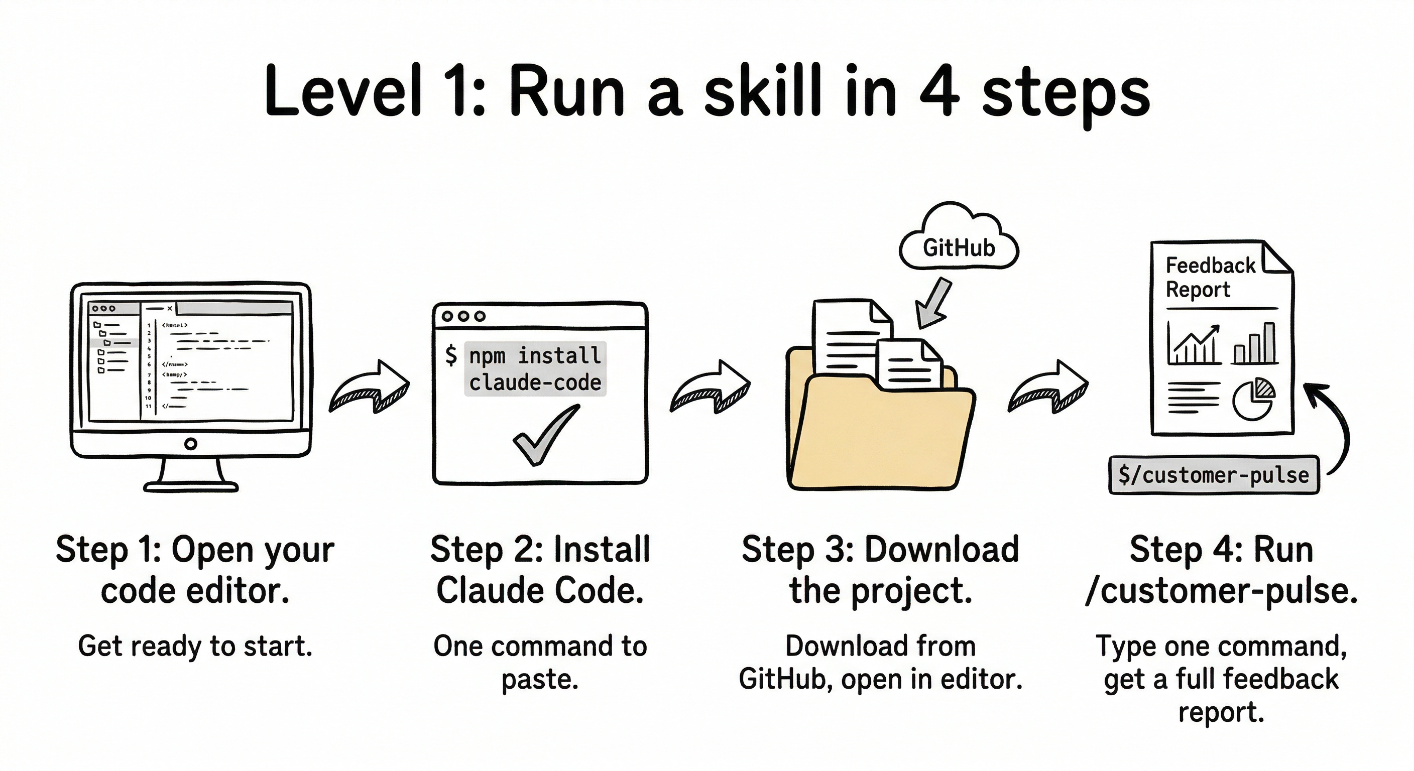 Level 1: Download the repo and run a skill. Get Claude Code installed, download the project, run the skill, and see a real feedback report.