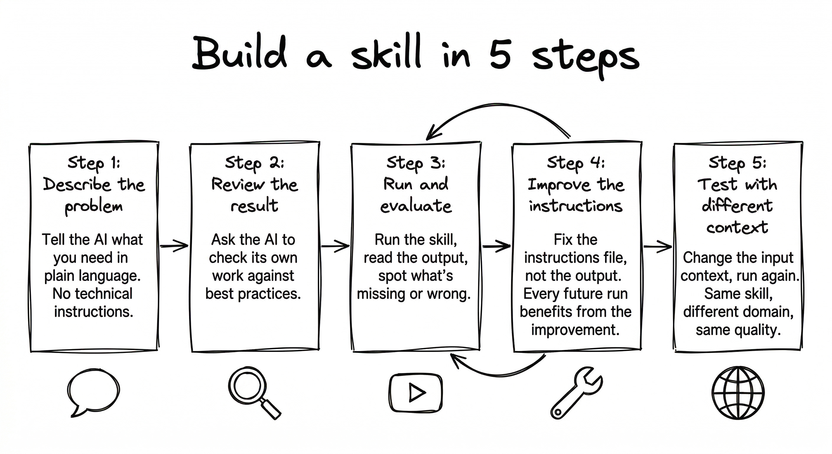 Build your own skills. Open Claude Code. Describe a problem you face every week. Here are five ideas: