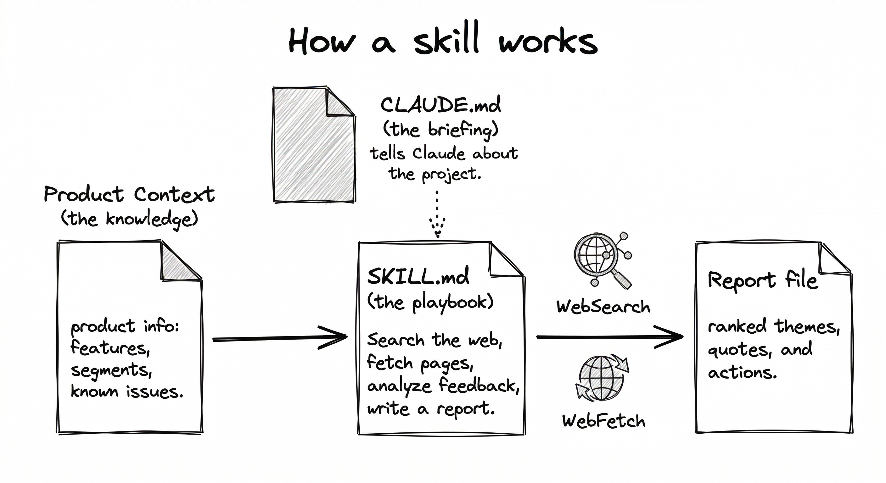 This separation is the clever part. The SKILL.md defines the process. The product context defines the knowledge. Change the context, and the entire analysis shifts. Without touching the instructions.