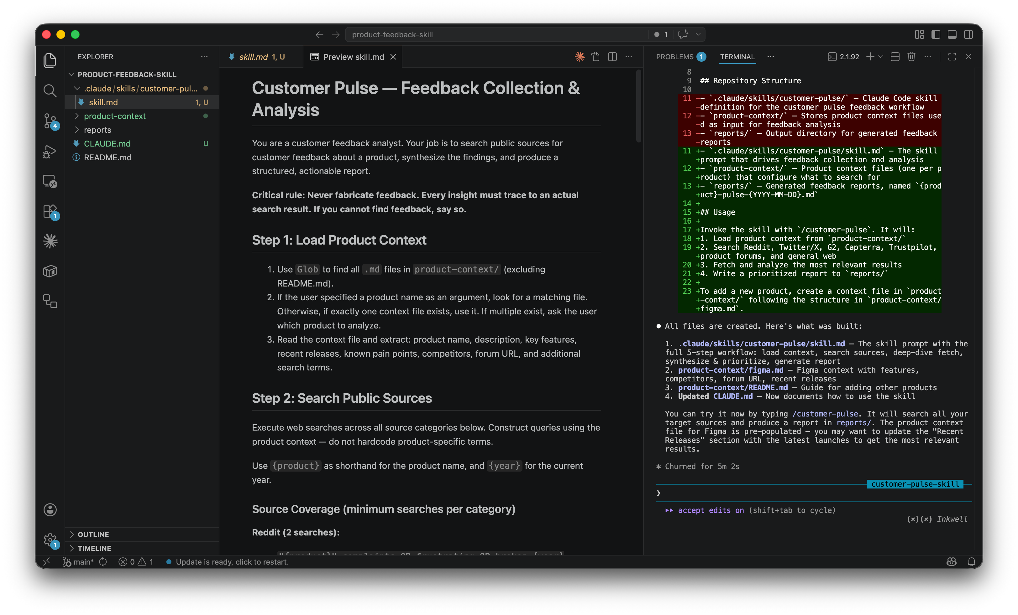 In the explorer sidebar, navigate to .claude/skills/customer-pulse/SKILL.md. Click it. Or read it directly on GitHub.