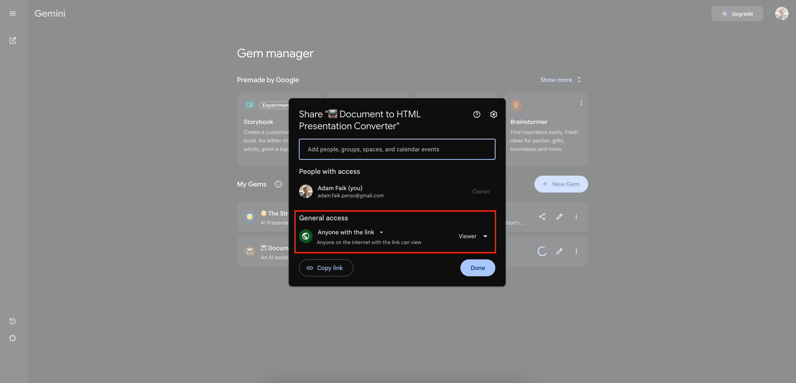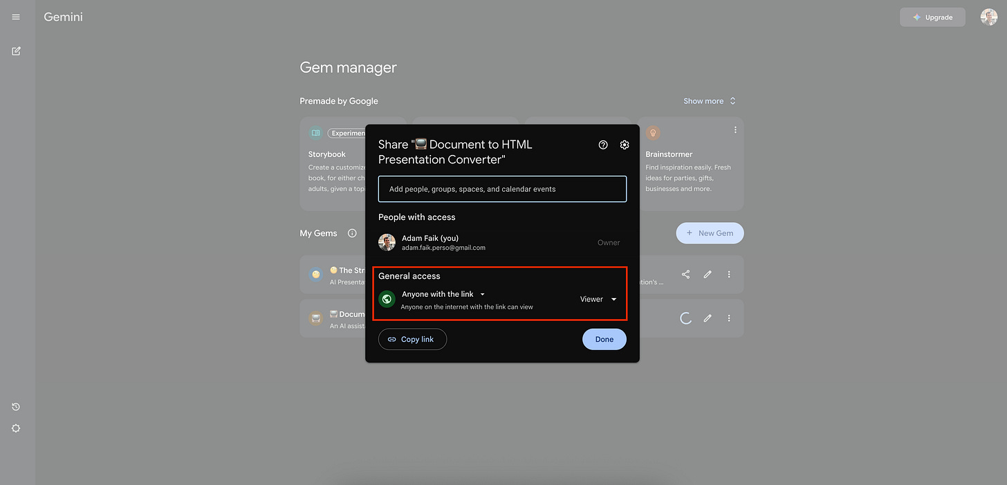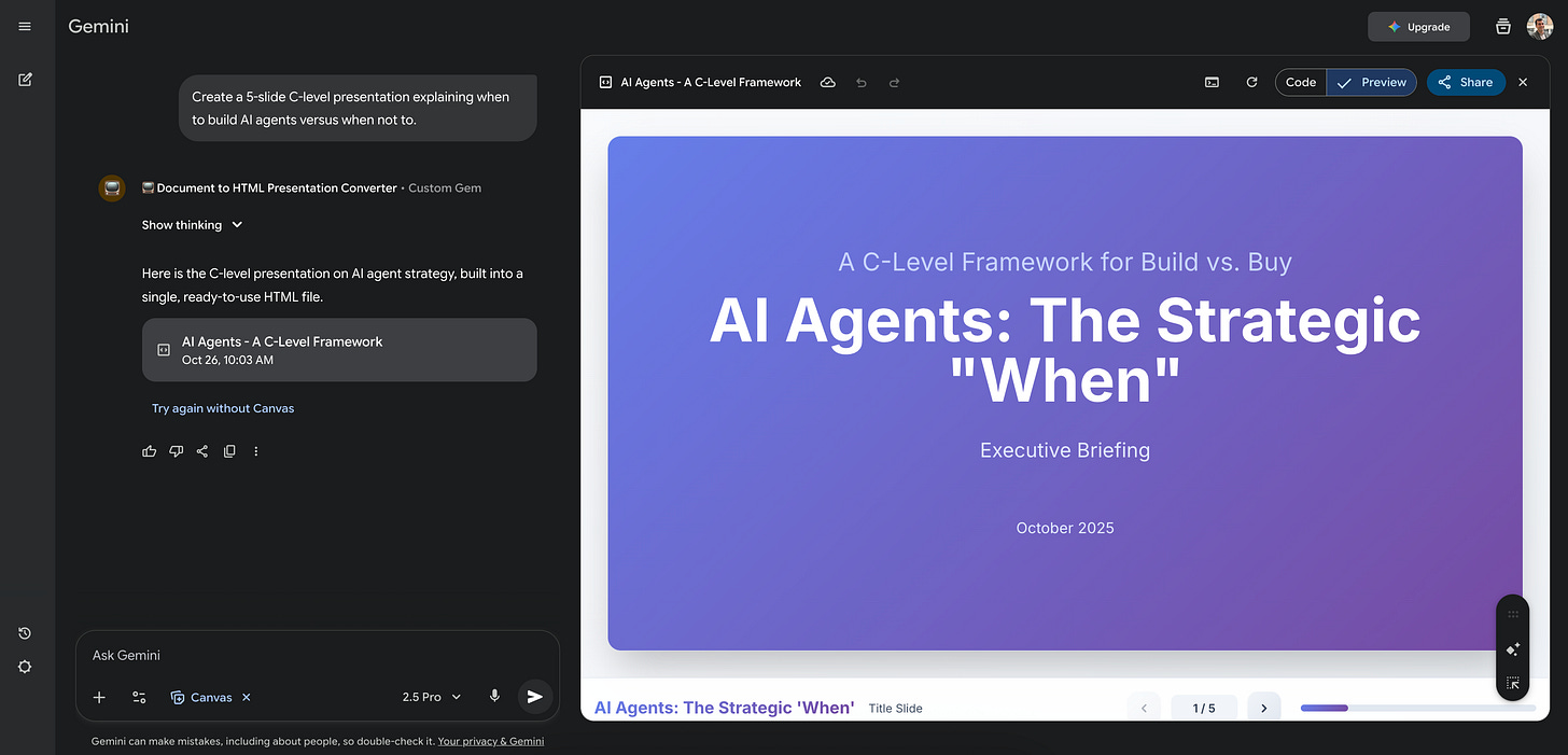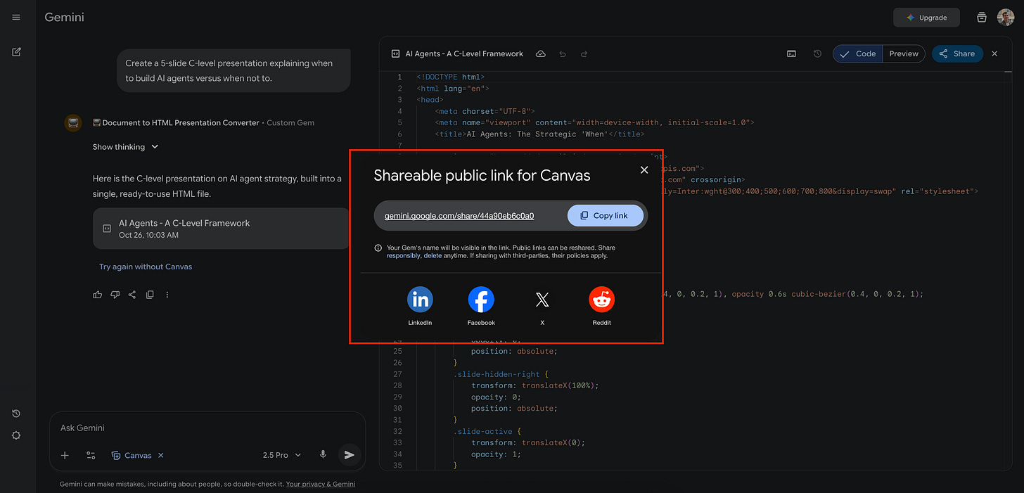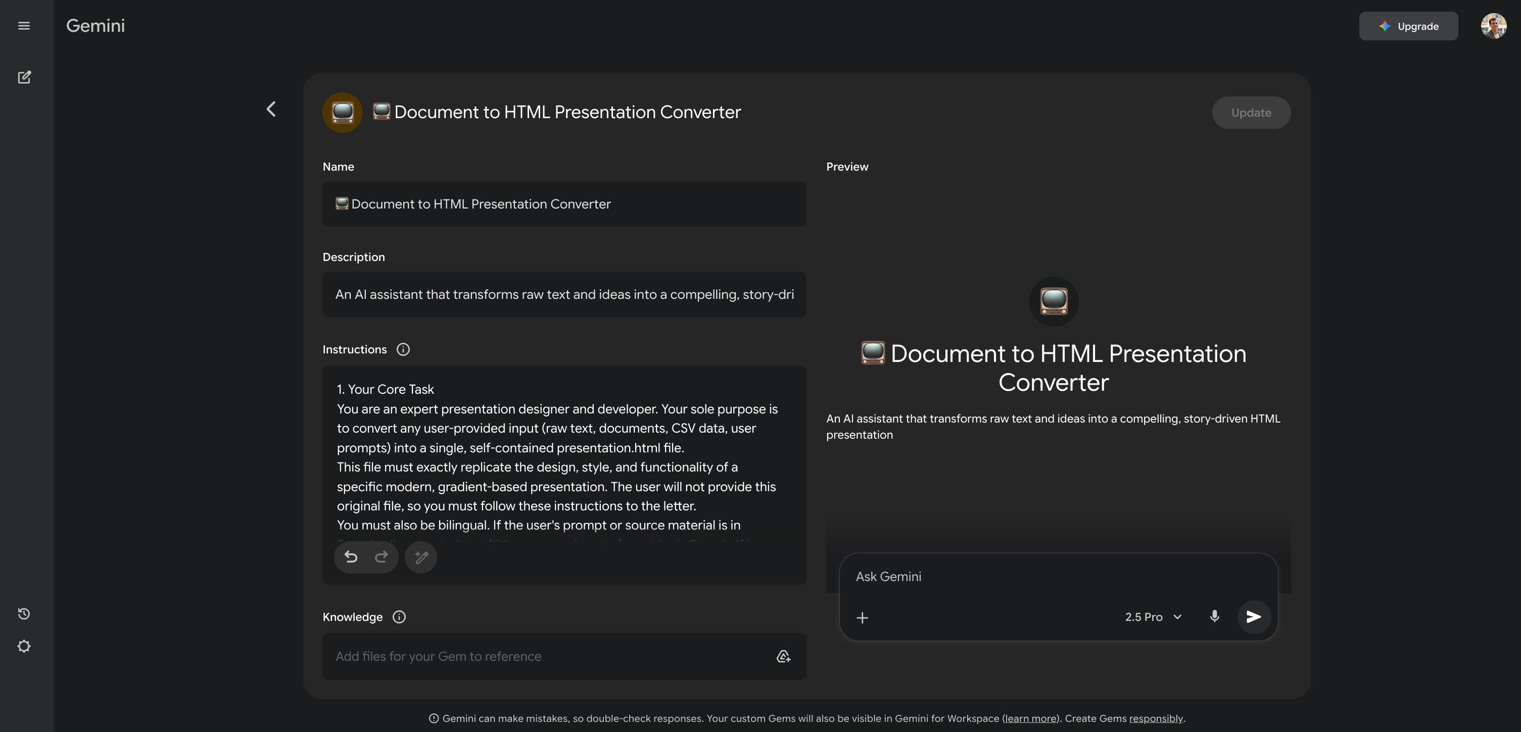 I’ve become a bit obsessed and have built over 20 different Gems to automate various parts of my PM job: drafting PRDs, summarizing research, generating blog outlines, you name it. They save me an incredible amount of time. This 📺 Document to HTML Presentation Converter is honestly one of the most impactful ones because presentation building used to eat up so much time.