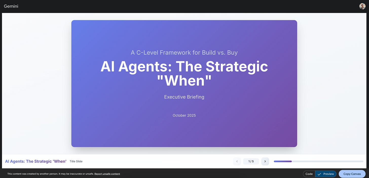 This workflow isn’t just a party trick; it’s a fundamental shift. It combines the best of human strategy (your deep understanding of the audience, the narrative structure, the core message) with the sheer speed and efficiency of AI execution (Gemini drafting, structuring, and the Gem itself building the final output). You focus on the thinking, the high-value PM work of clarifying the what and why, and let your AI co-pilot handle the tedious mechanics of slide building. The result? You get back hours, force clearer thinking upfront, and produce clean, effective communication artifacts faster than ever before.