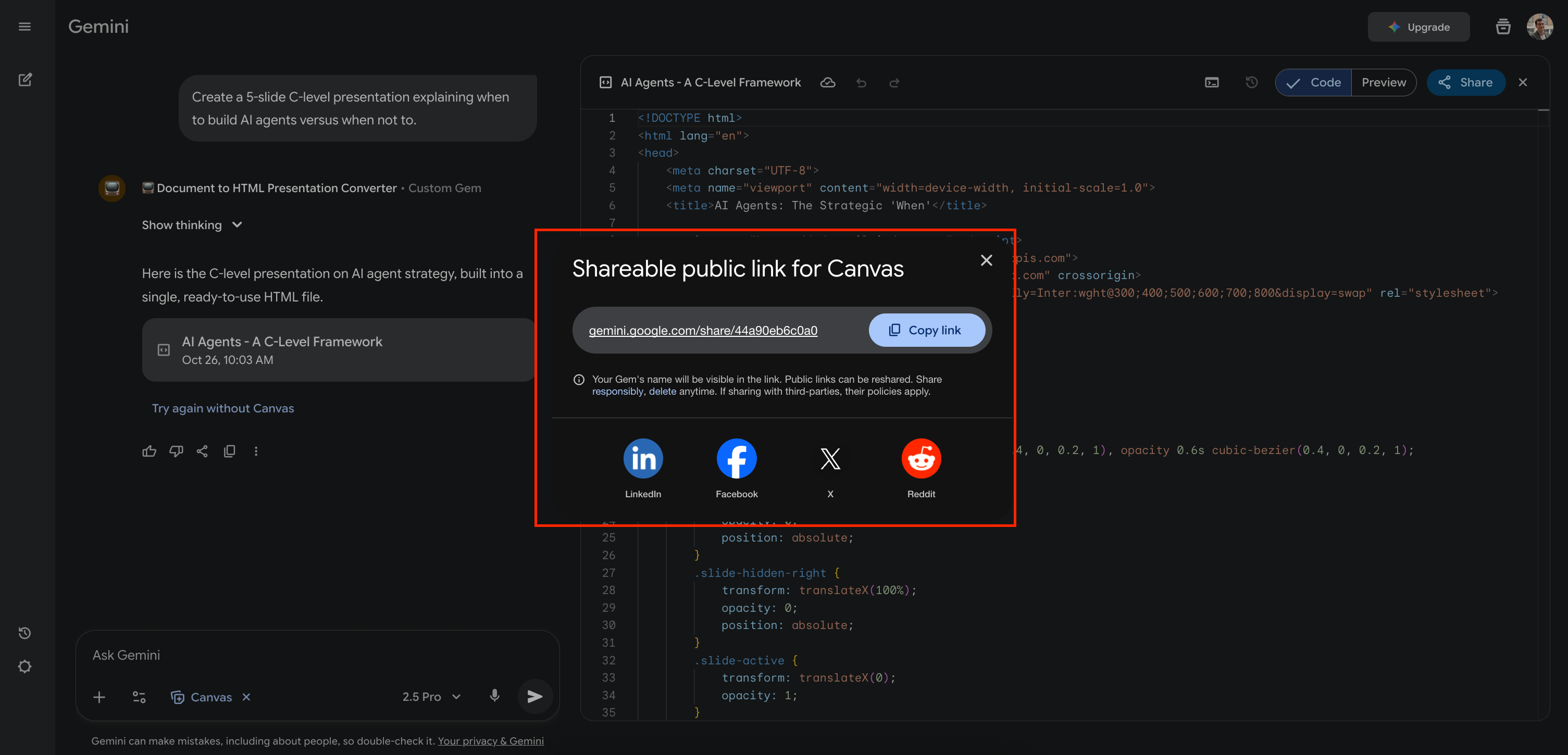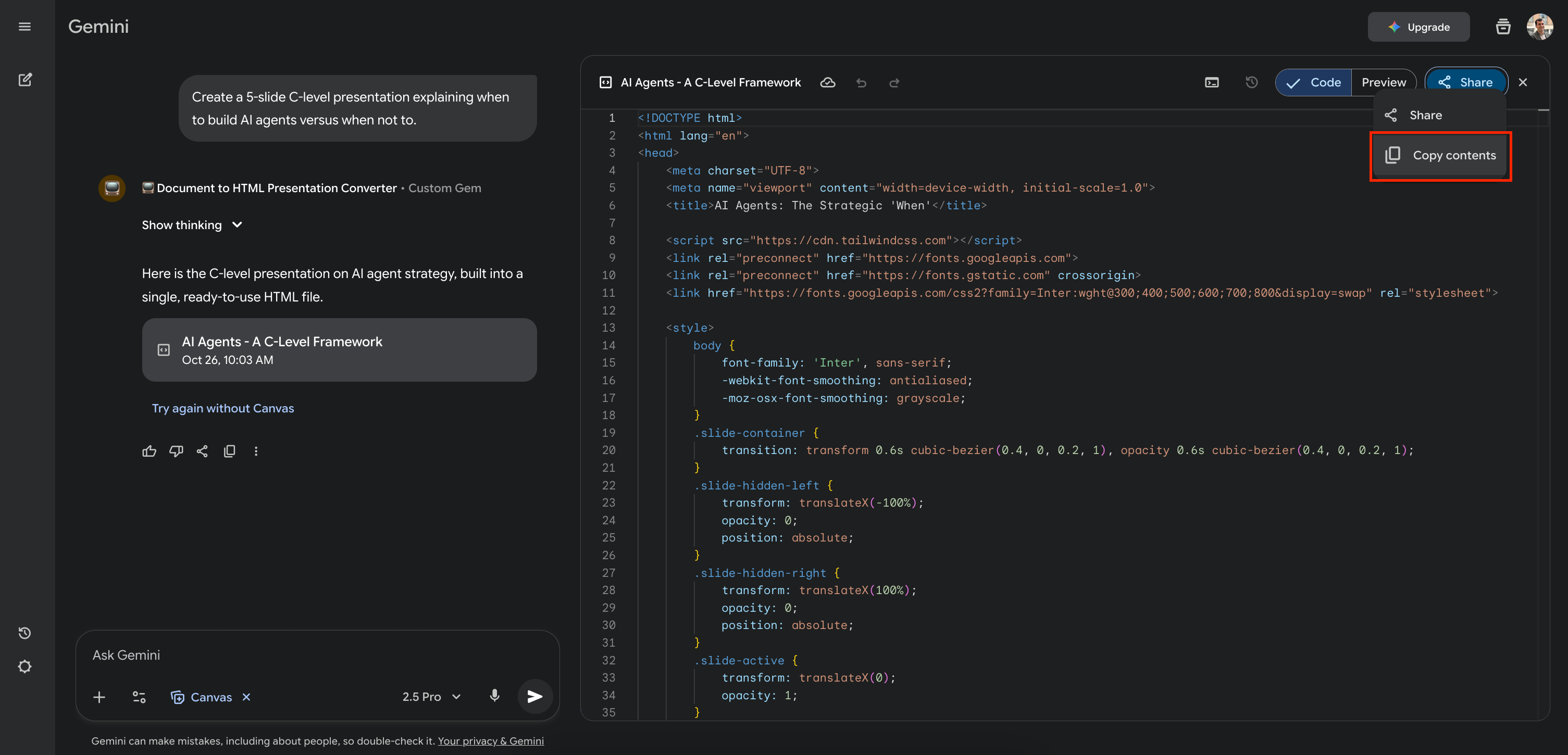 Share button, then Copy contents to grab the entire HTML code, ready to paste into your text editor and save as an .html file.Option 2, the “Google Slide” killer: You can also create a shareable link directly from Gemini. With this link, anyone can get access to your presentation full-screen, just as if it were a Google Slide, and explore it on their own.