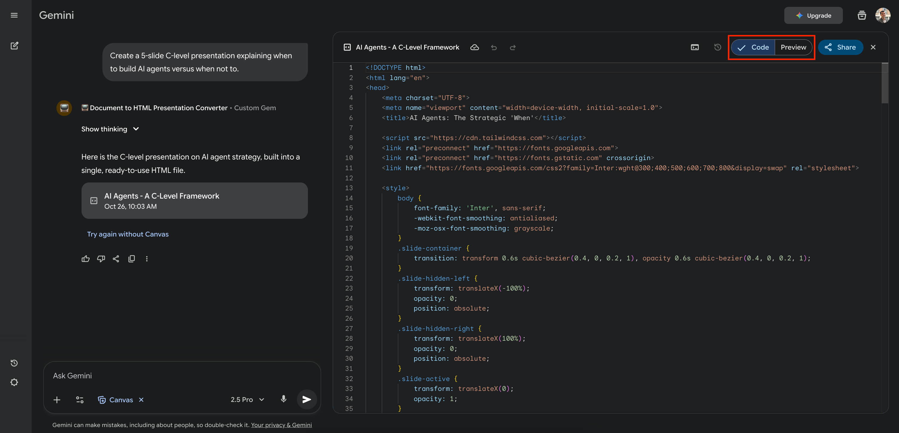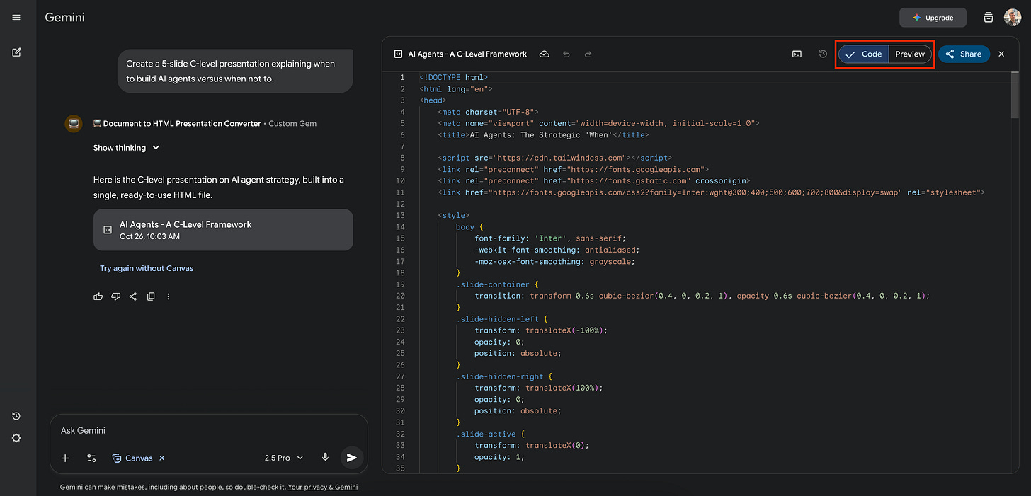 Hit Enter. Gemini will think for a moment, show you a preview, and then provide the full HTML code for the presentation.