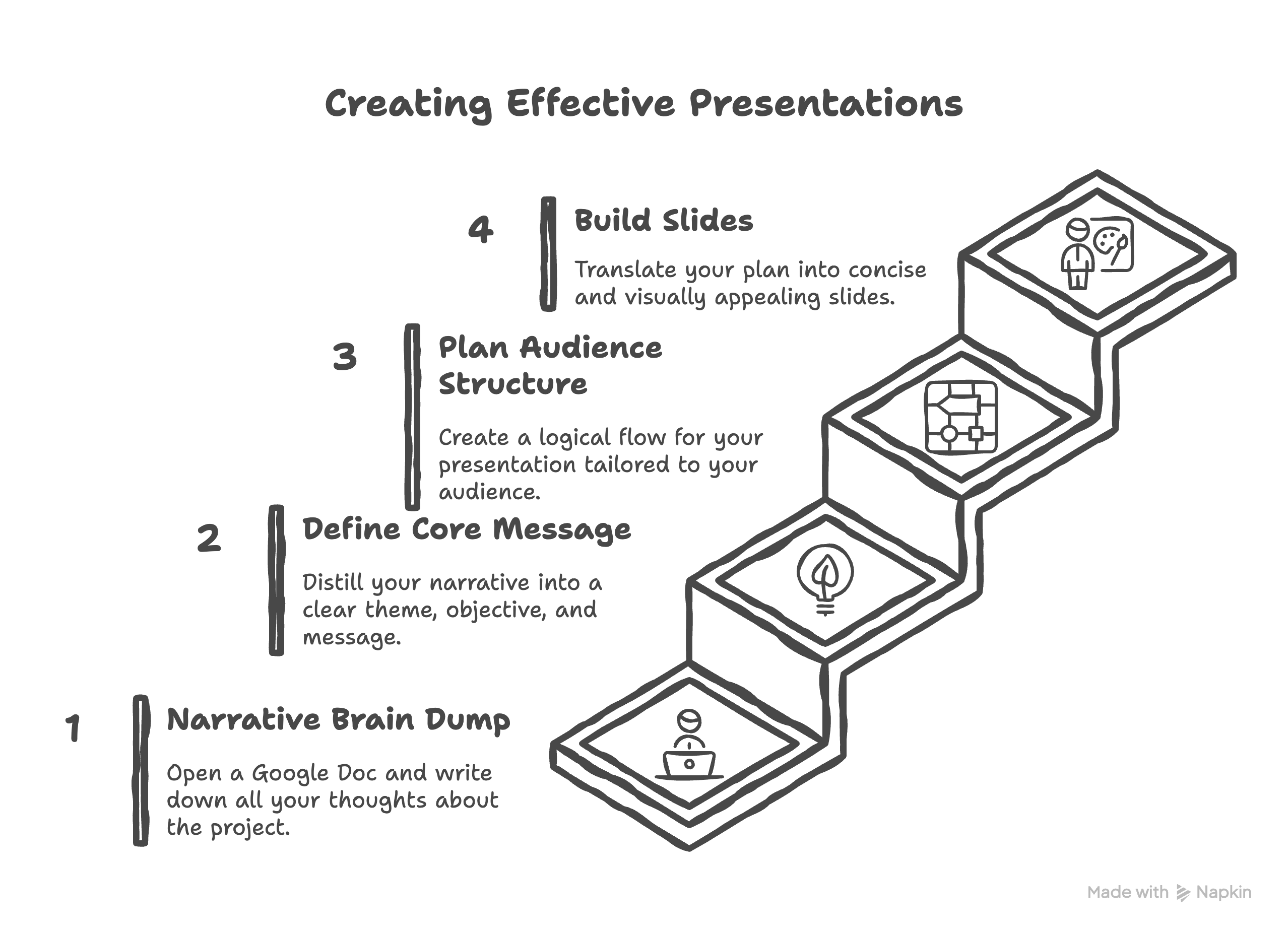 Action: Open a Google Doc, not Slides. Just write. Dump all your thoughts about the project, the problem, the solution, the data, the challenges.