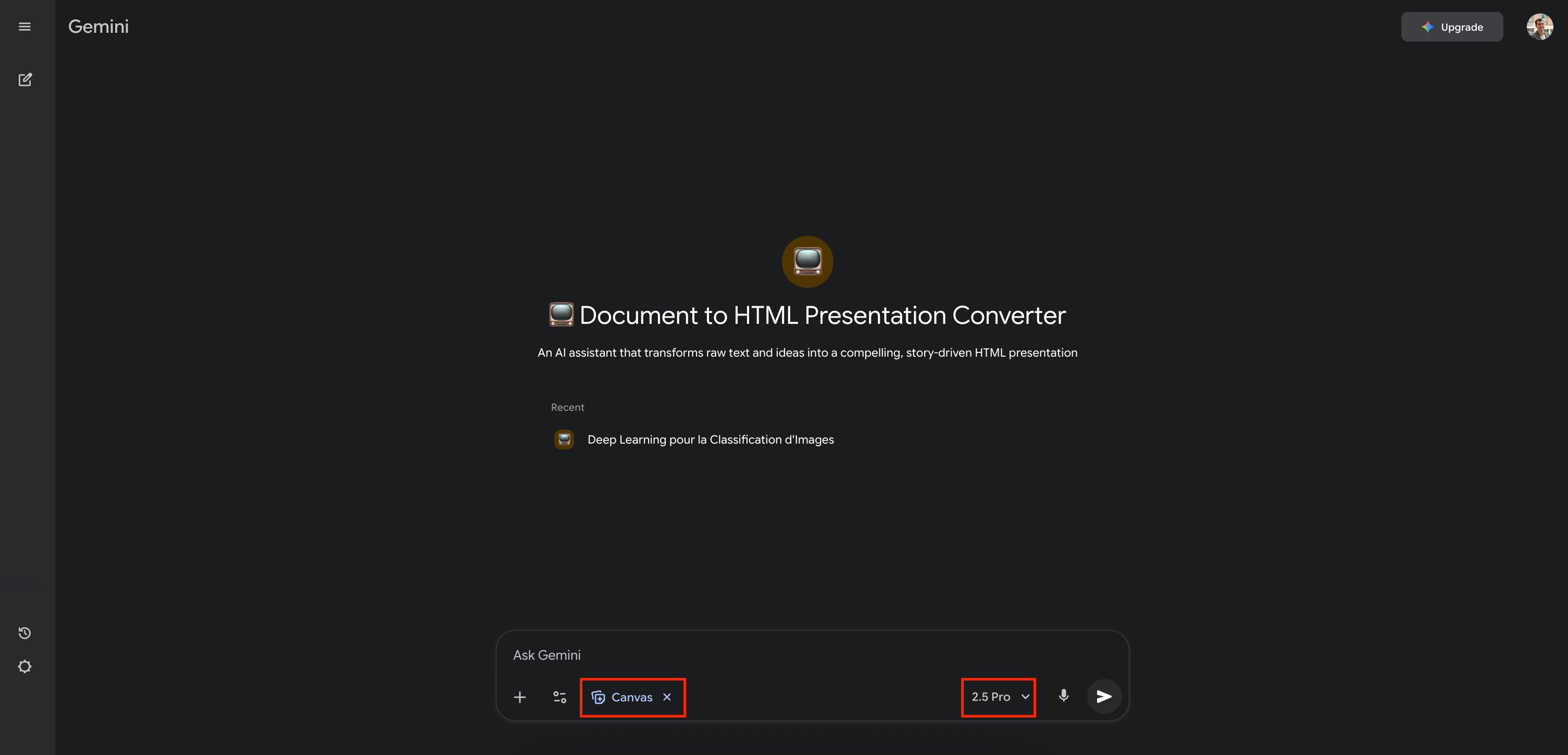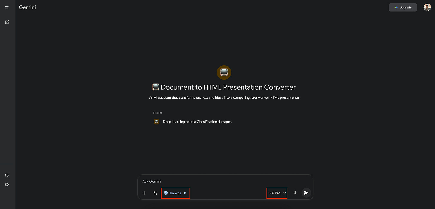 The key is this specific Gemini assistant, I named: 📺 Document to HTML Presentation Converter. Bookmark this link. When you open it, make sure you’re using the “2.5 Pro” model and that the “Canvas” tool is enabled.