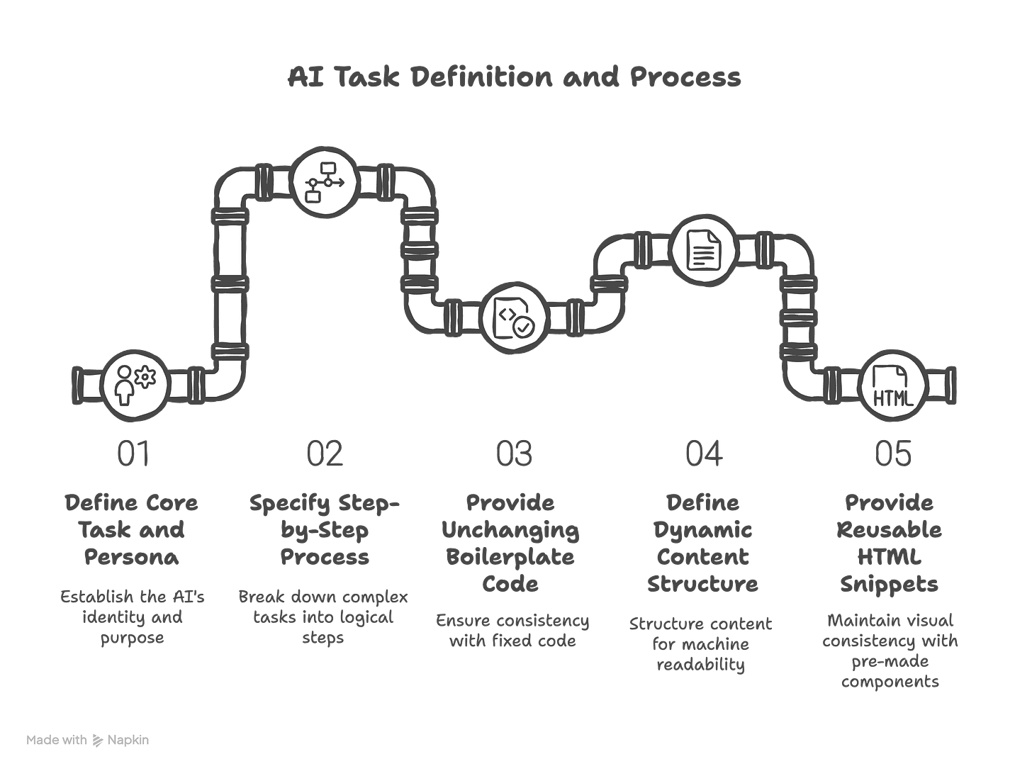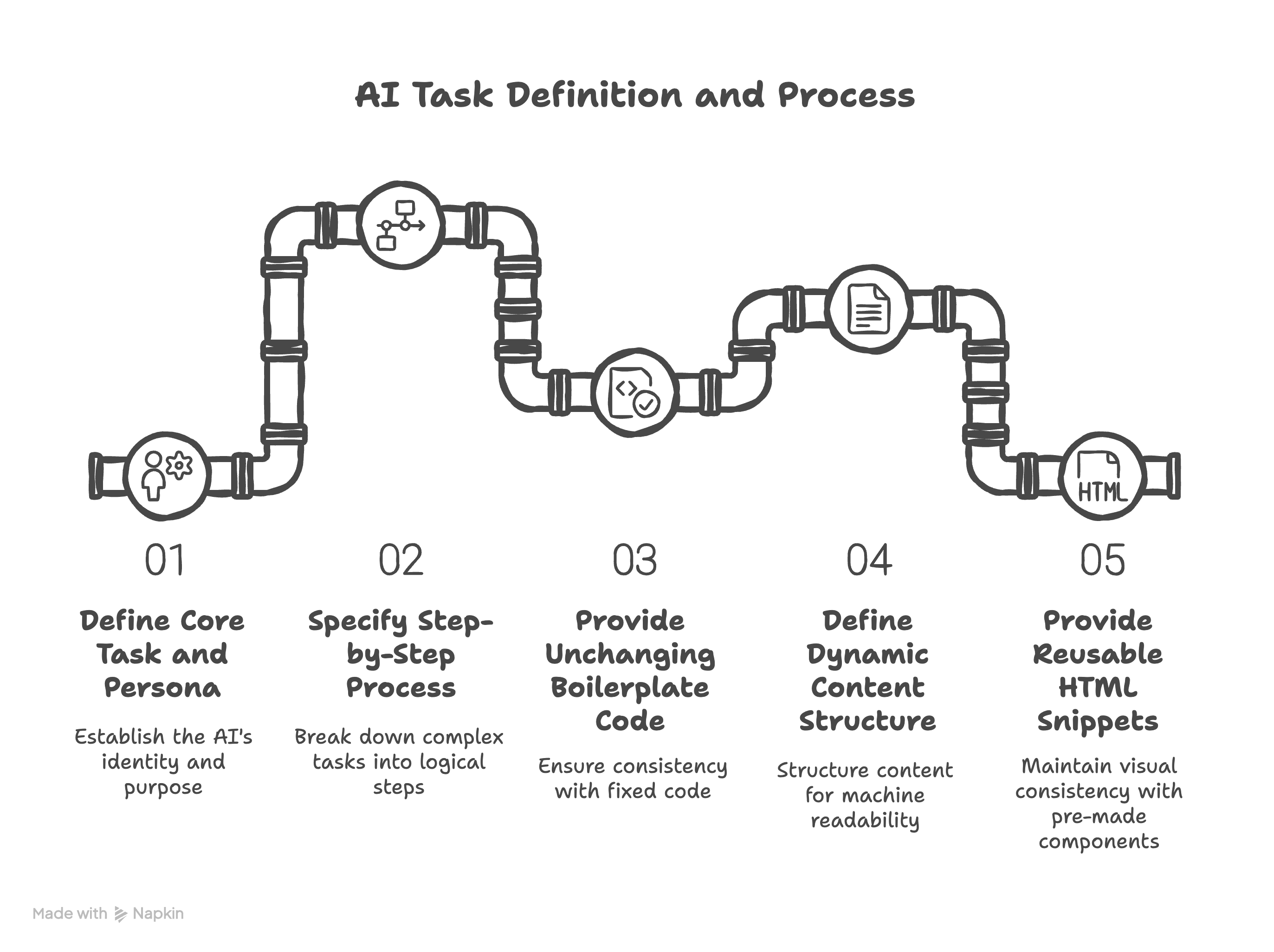 By providing these detailed, layered instructions, defining the persona, the process, the static code, the dynamic data structure, and the reusable visual components, I could reliably guide Gemini to act as a specialized front-end developer, automating the creation of consistently styled HTML presentations.