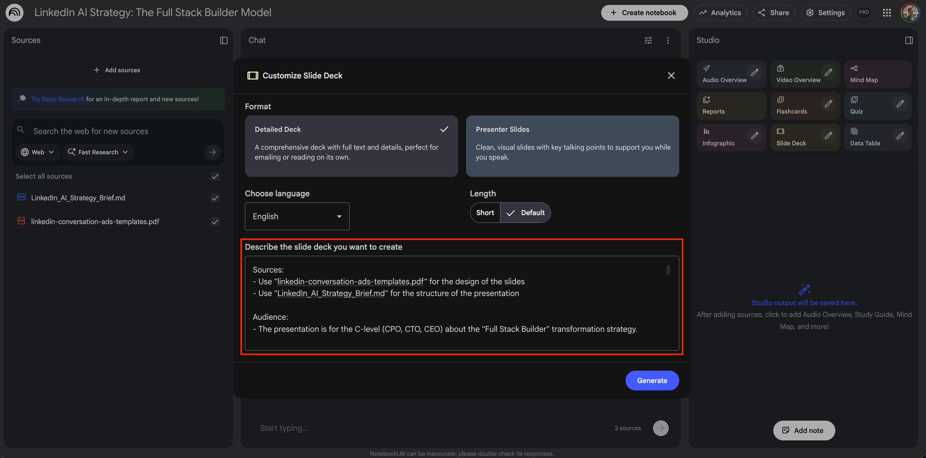 The use case example: For the LinkedIn strategy deck, here is the actual prompt I used to turn the C-Level brief into a first presentation: