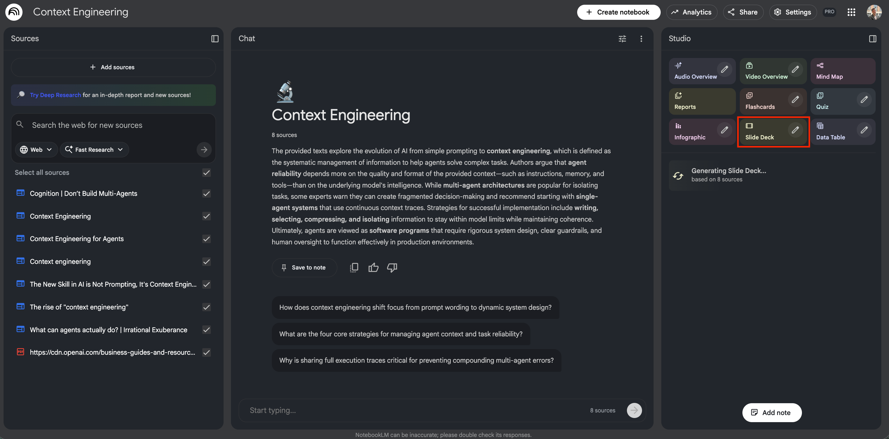 This was my first attempt. I uploaded a set of resources found on the Internet on context engineering and asked for a summary deck.