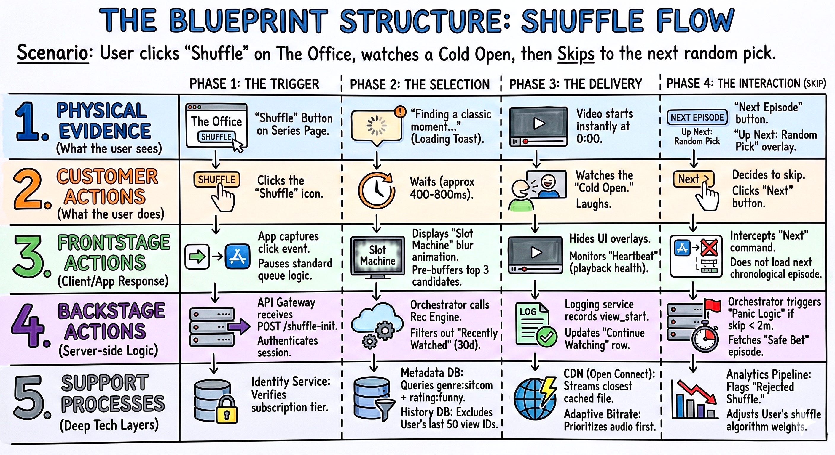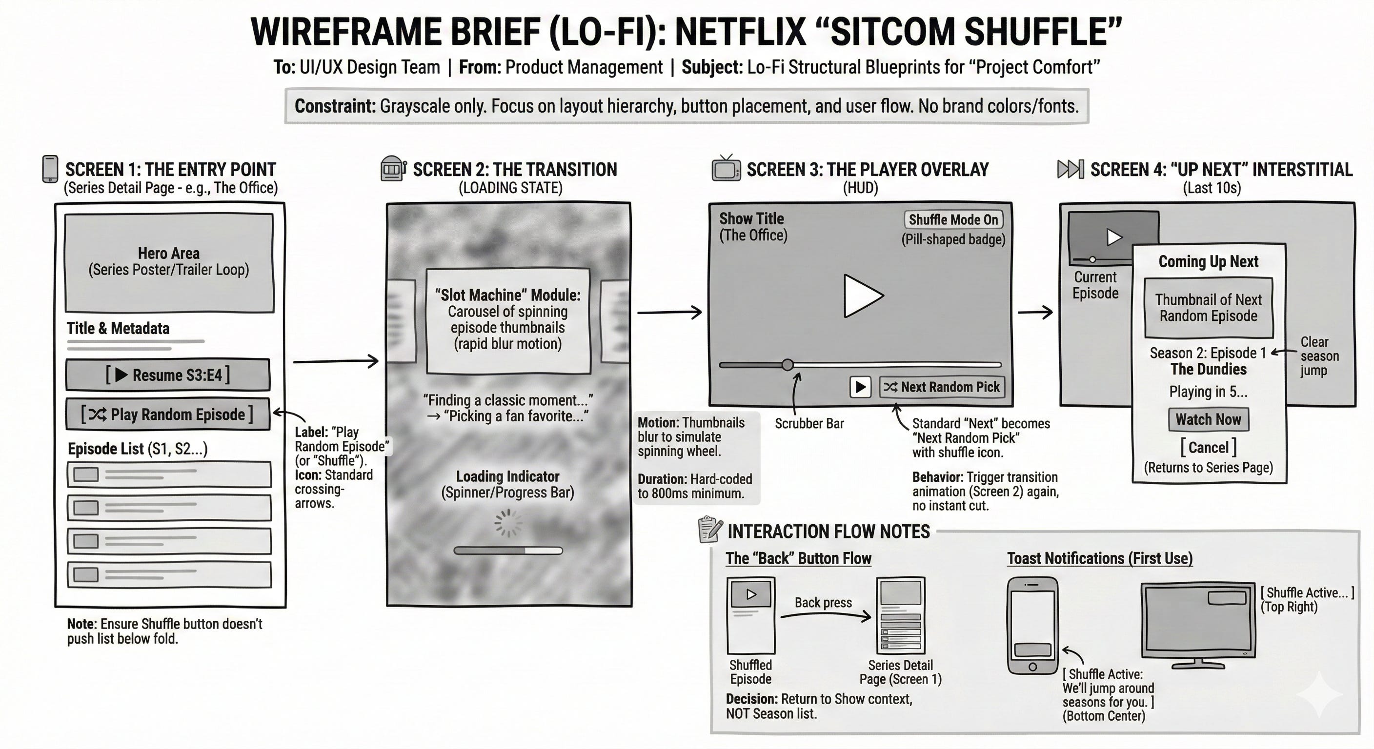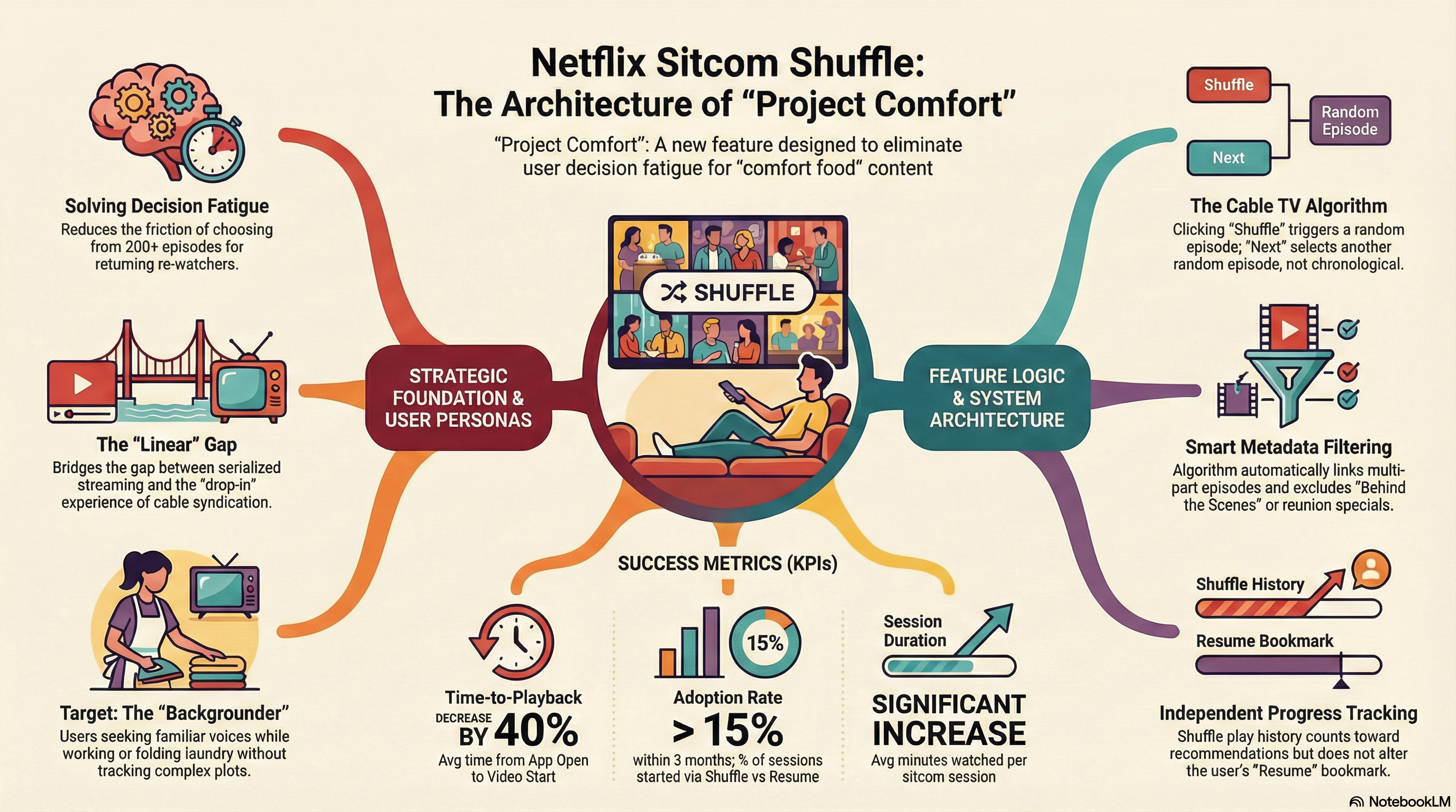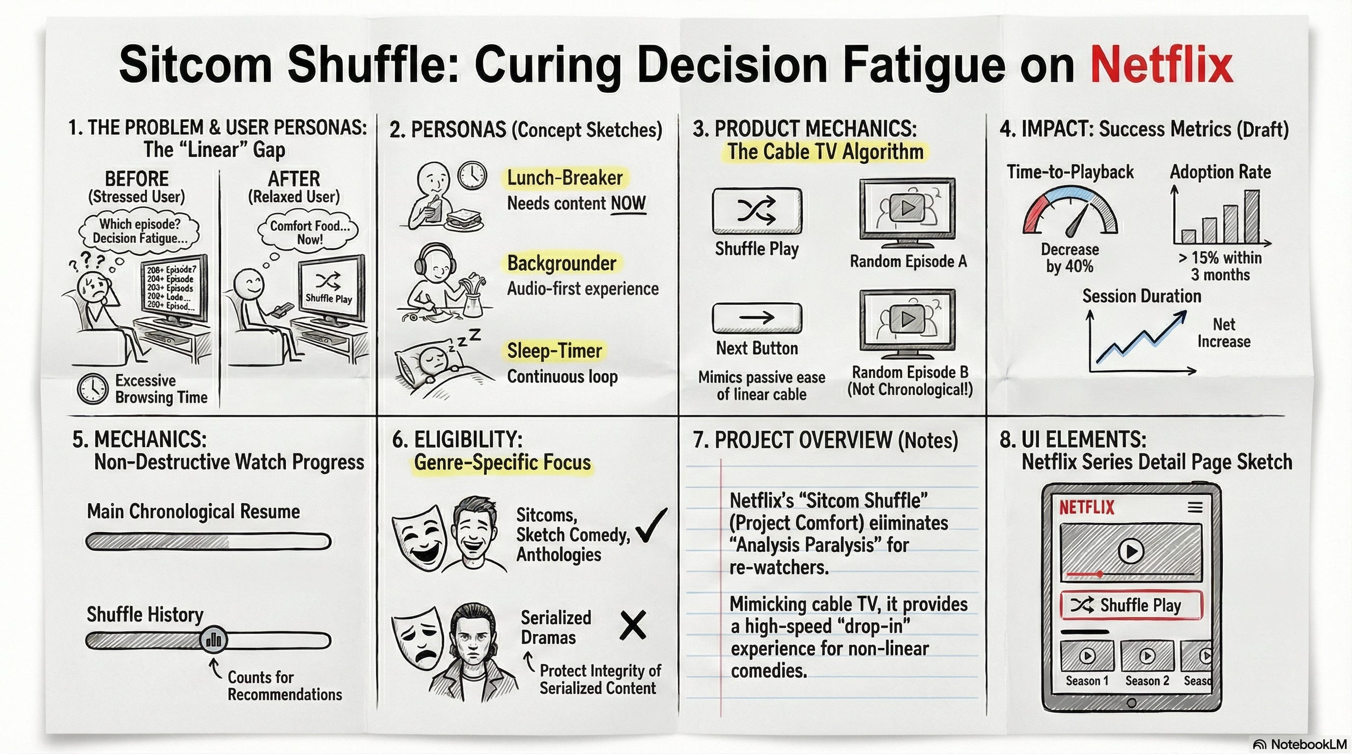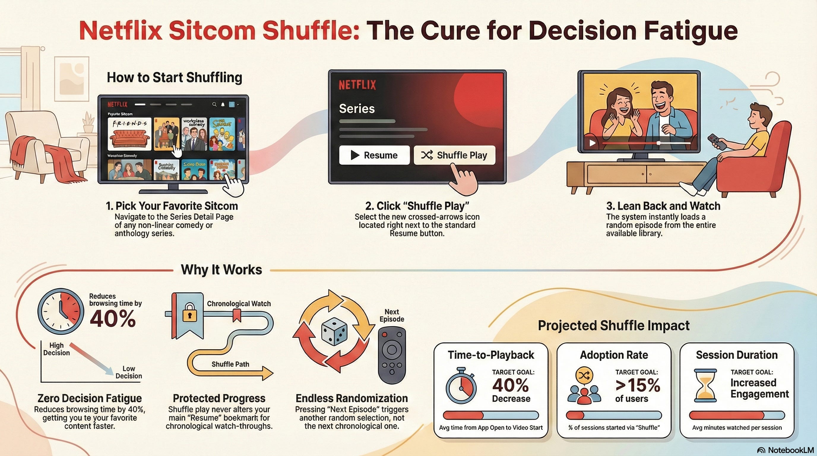 Act as a product manager at Netflix working on the new random shuffle feature.