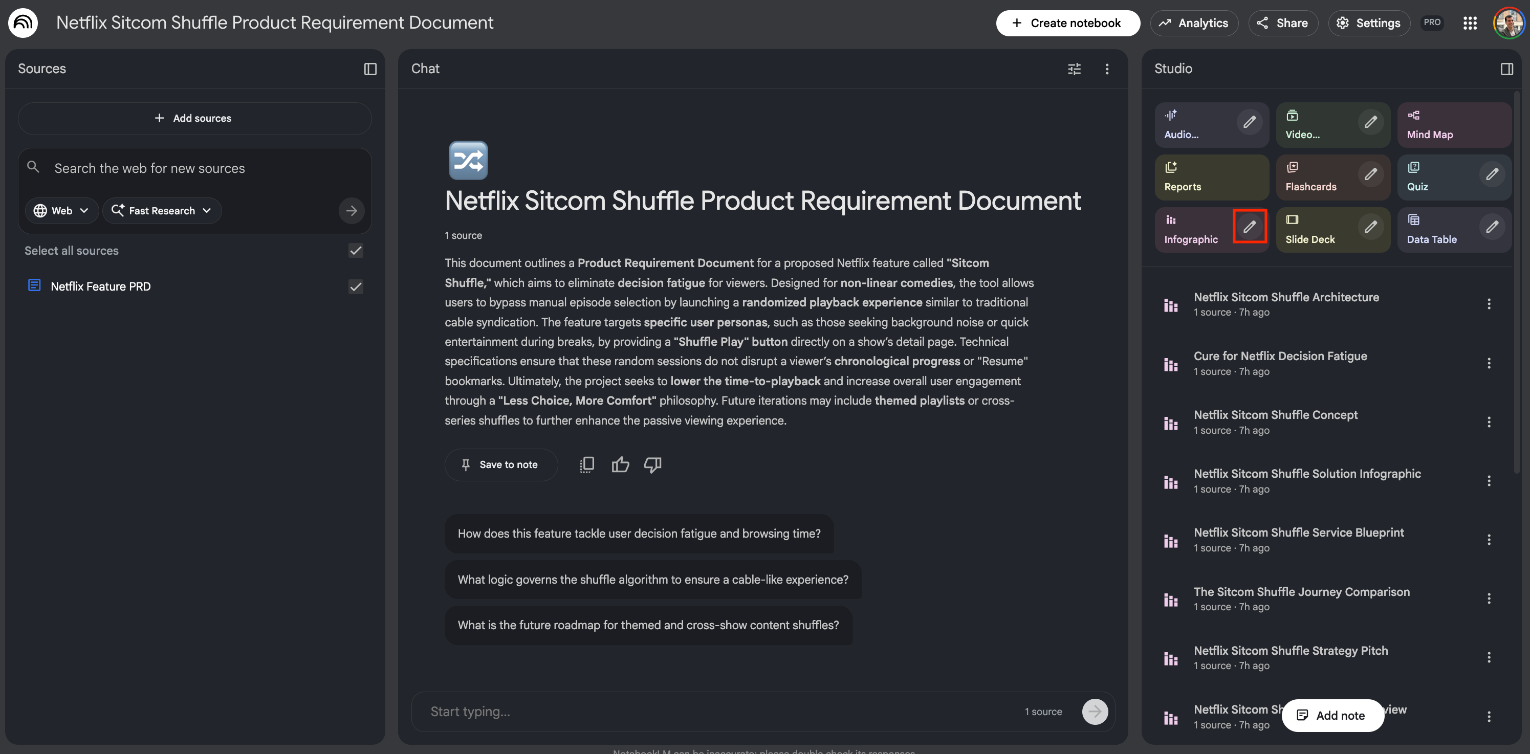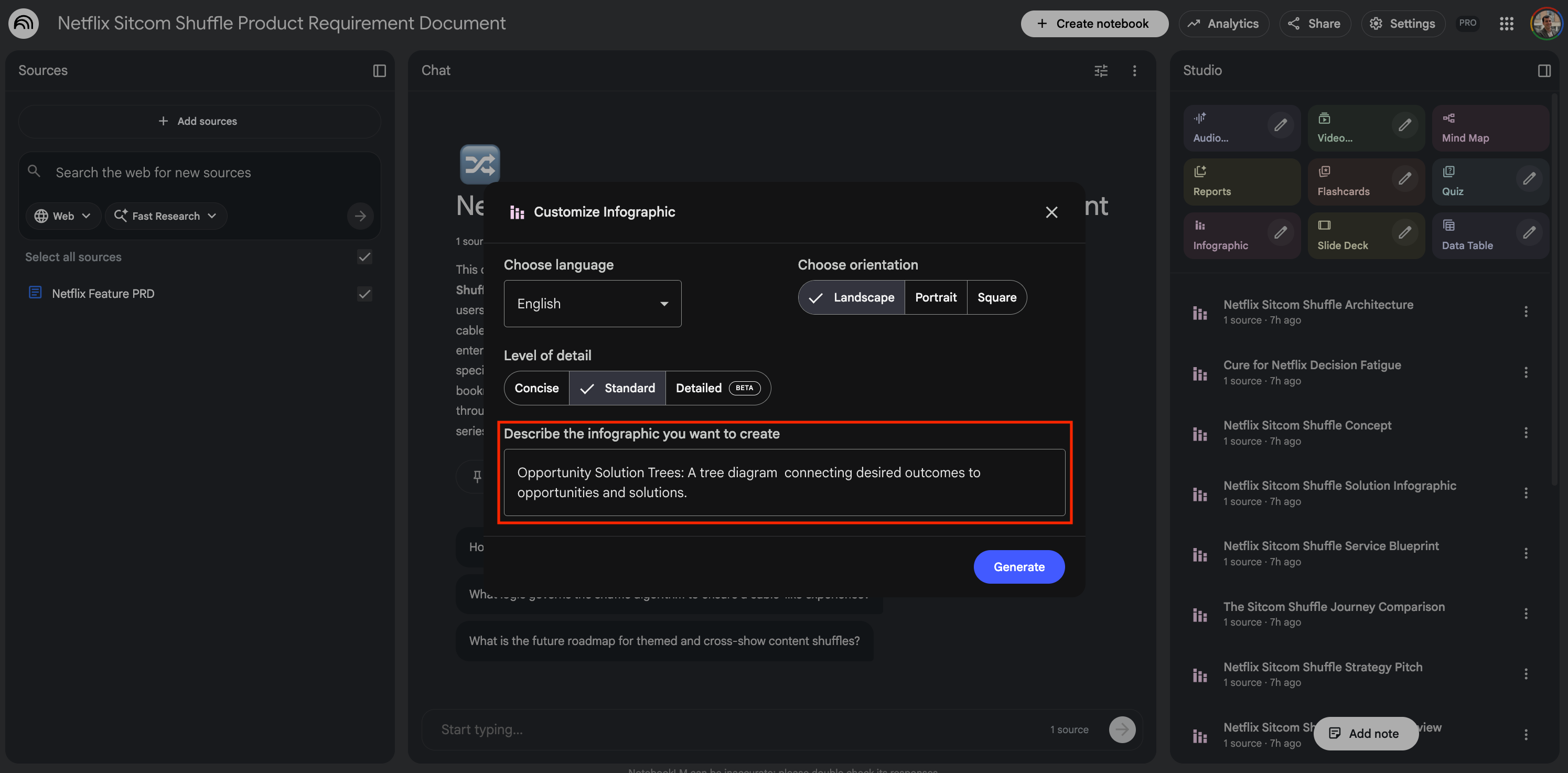 First, I tried a quick and fun experiment. I asked Gemini to write a PRD for this feature. I exported it to Google Docs and imported it into NotebookLM. Then, I asked NotebookLM to generate the infographics directly.