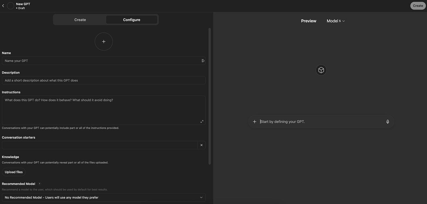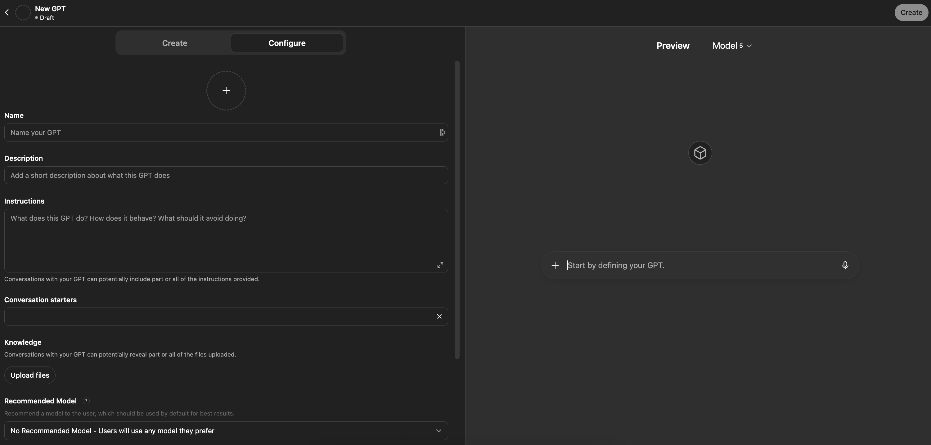 Once you’re satisfied with the instructions, switch to your second tab. Navigate to GPTs and click Create.