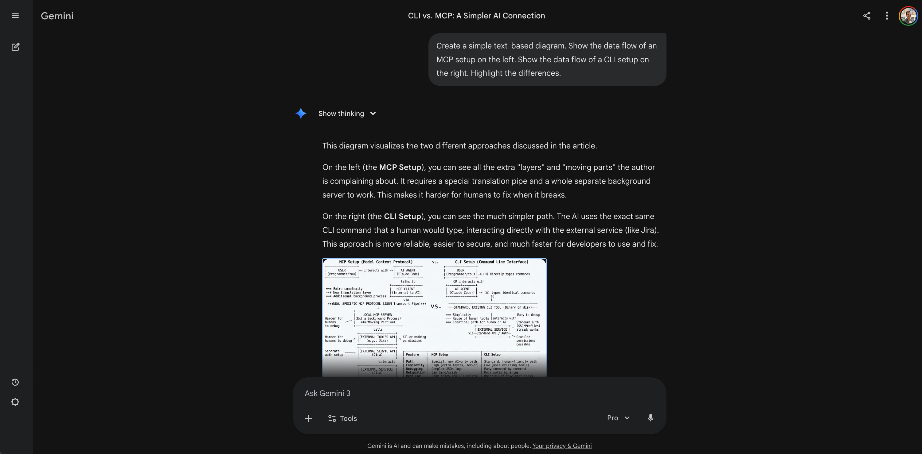 Result: The AI generated a clean, comparative breakdown of the two architectures. It showed me the messy, extra layers of an MCP versus the direct path of a CLI. Seeing it visually mapped out made the abstract engineering concepts instantly click in my brain.