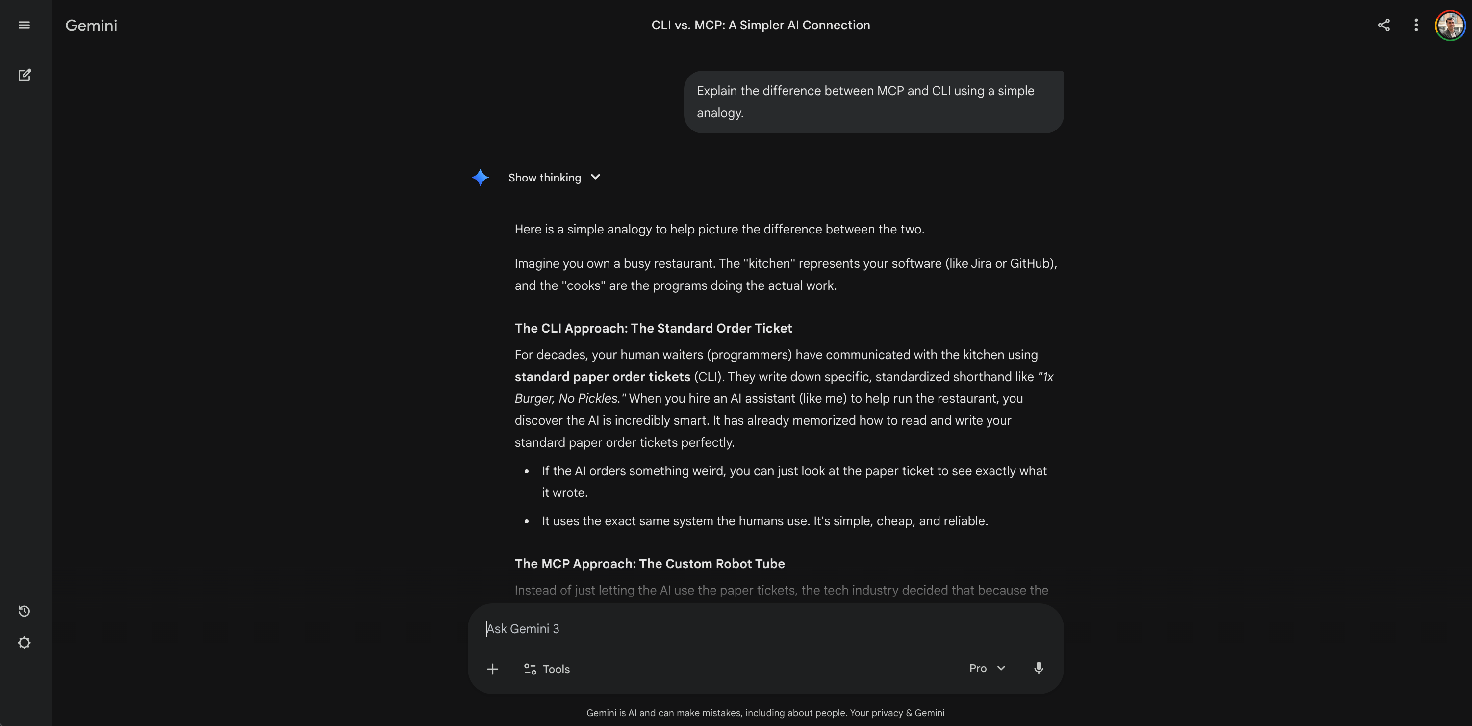 Result: The AI gave me a restaurant metaphor. The CLI is a standard paper order ticket used by human waiters. The MCP is a highly expensive, glitchy pneumatic tube system built specifically for a robot to use. This kind of analogy is helpful when you have to explain technical debt to business stakeholders.