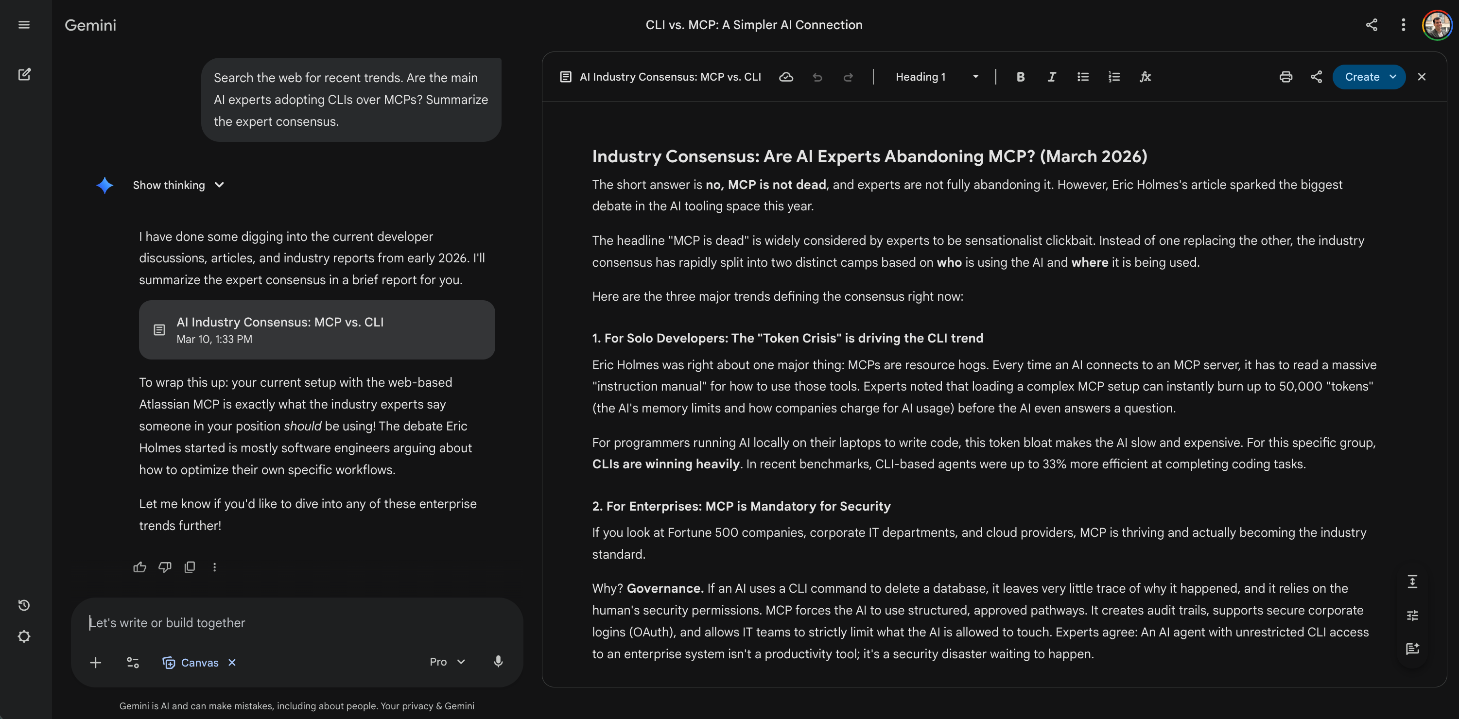 Result: The article was just one man’s opinion. The AI searched the live web and brought me the actual market reality. It turns out the headline was clickbait. Solo developers use CLIs to save money, but major enterprises mandate MCPs for strict security and governance. The AI grounded the author’s opinion in objective, current market data.