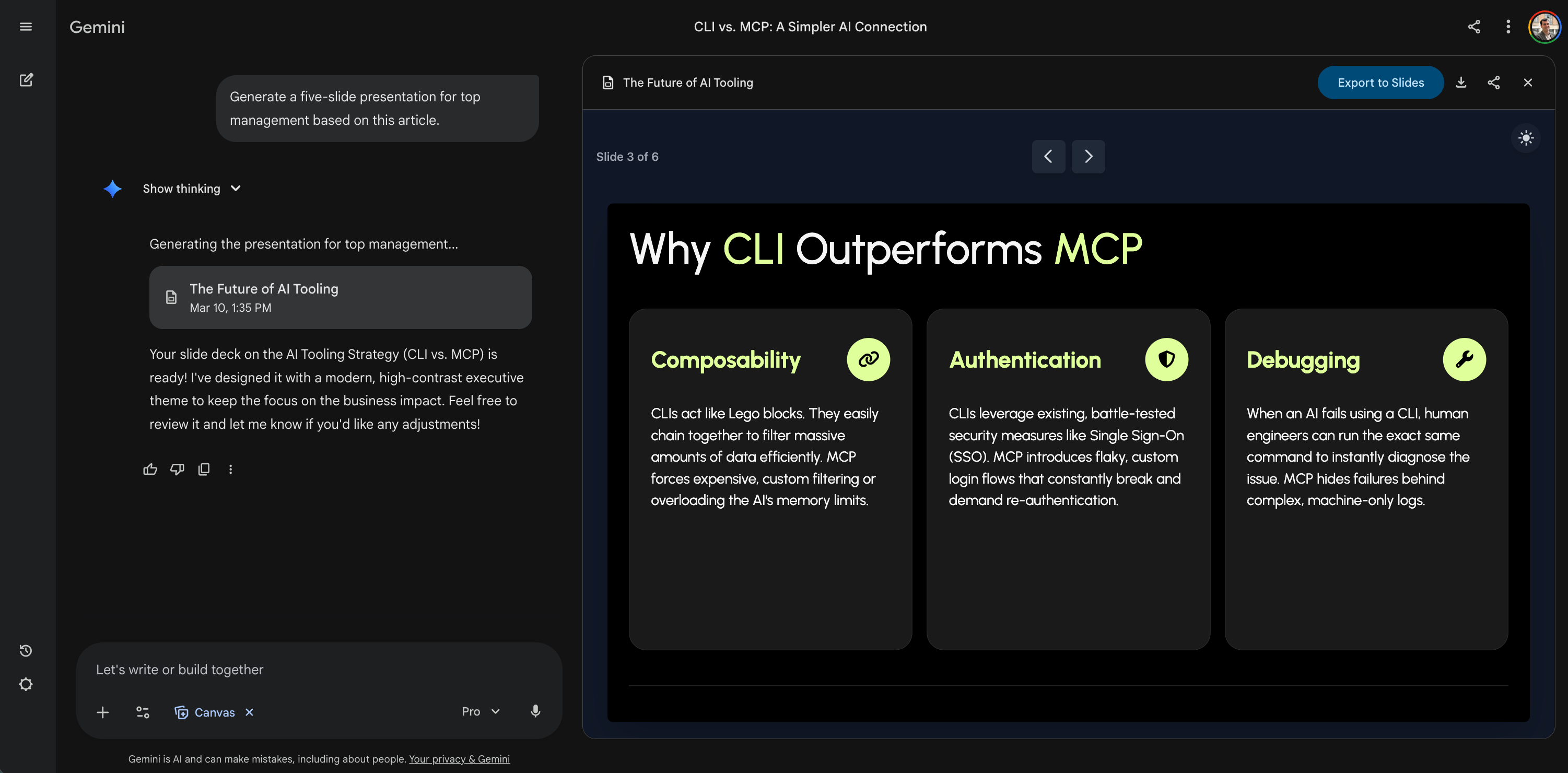 Result: The AI generated an actual, fully formatted visual presentation right there in the chat. It built the slides, organized the bullet points into clean columns, and gave me a button to instantly export it to Google Slides. With some effort, I went from not understanding a highly technical article to having a ready-to-pitch visual deck for my CEO.
