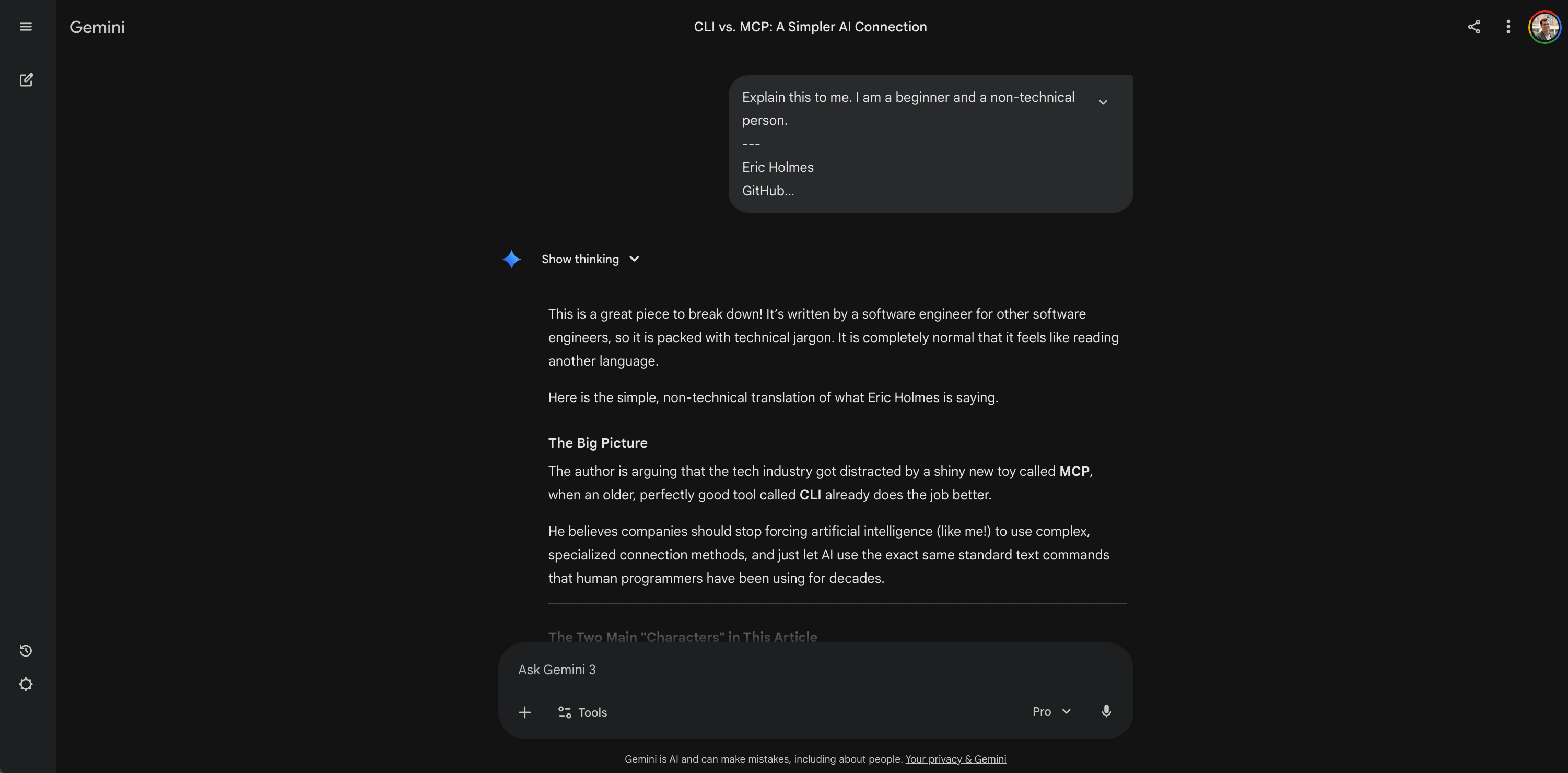 Result: The AI instantly acted as a perfect translator. It stripped away the developer ego jargon. It gave me the big picture. It told me the author thinks the tech industry got distracted by a shiny new toy (MCP) when an old, reliable tool (CLI) does the job better. It gave me five simple, business-focused reasons why. I went from completely lost to understanding the core debate in thirty seconds.
