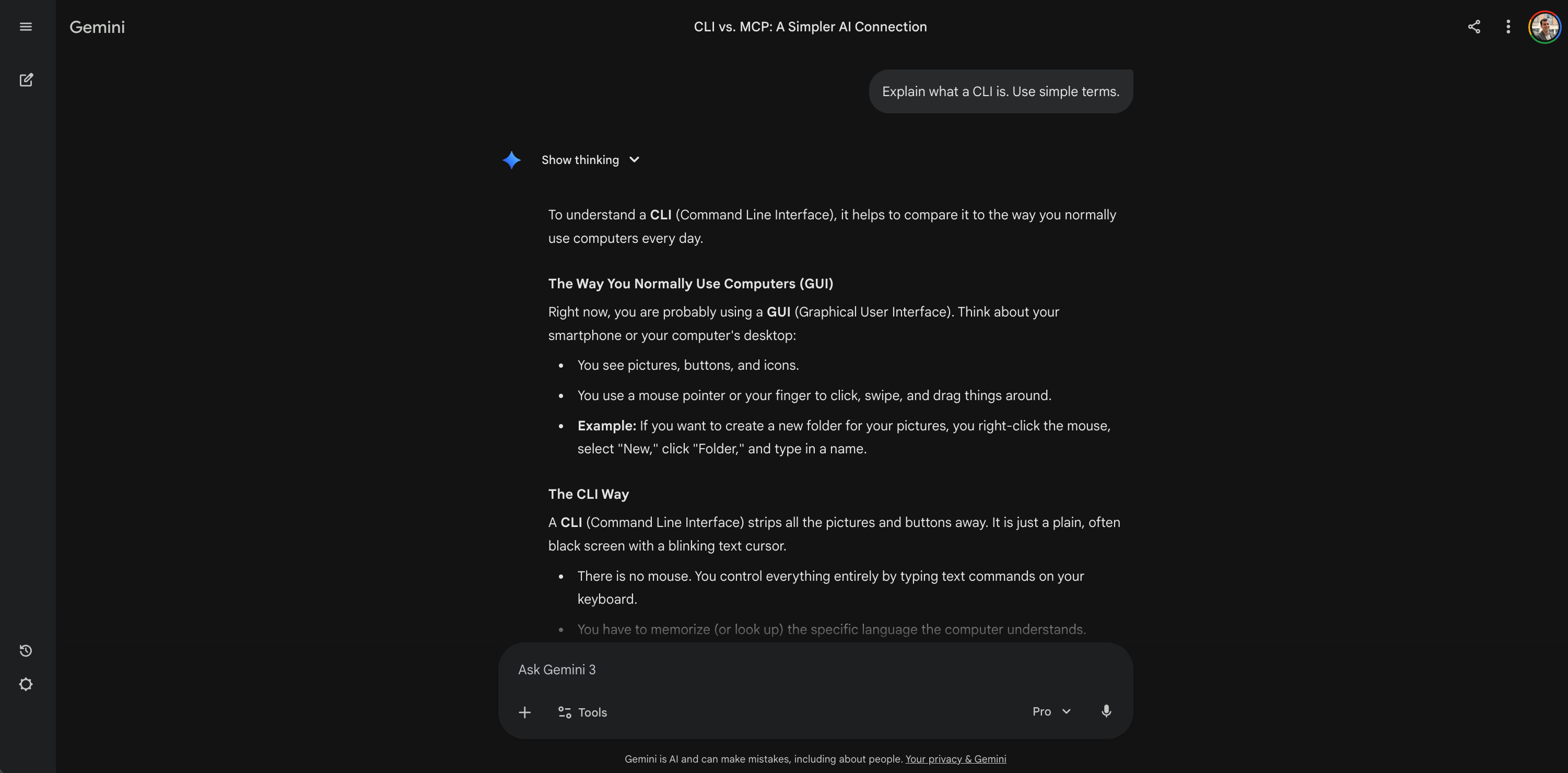 Result: The AI stripped away the jargon by comparing a CLI to how I normally use my computer. It contrasted the visual buttons and mouse clicks we use every day with the blank, text-only screen of a command line. It made the underlying concept instantly relatable without relying on a single line of code.