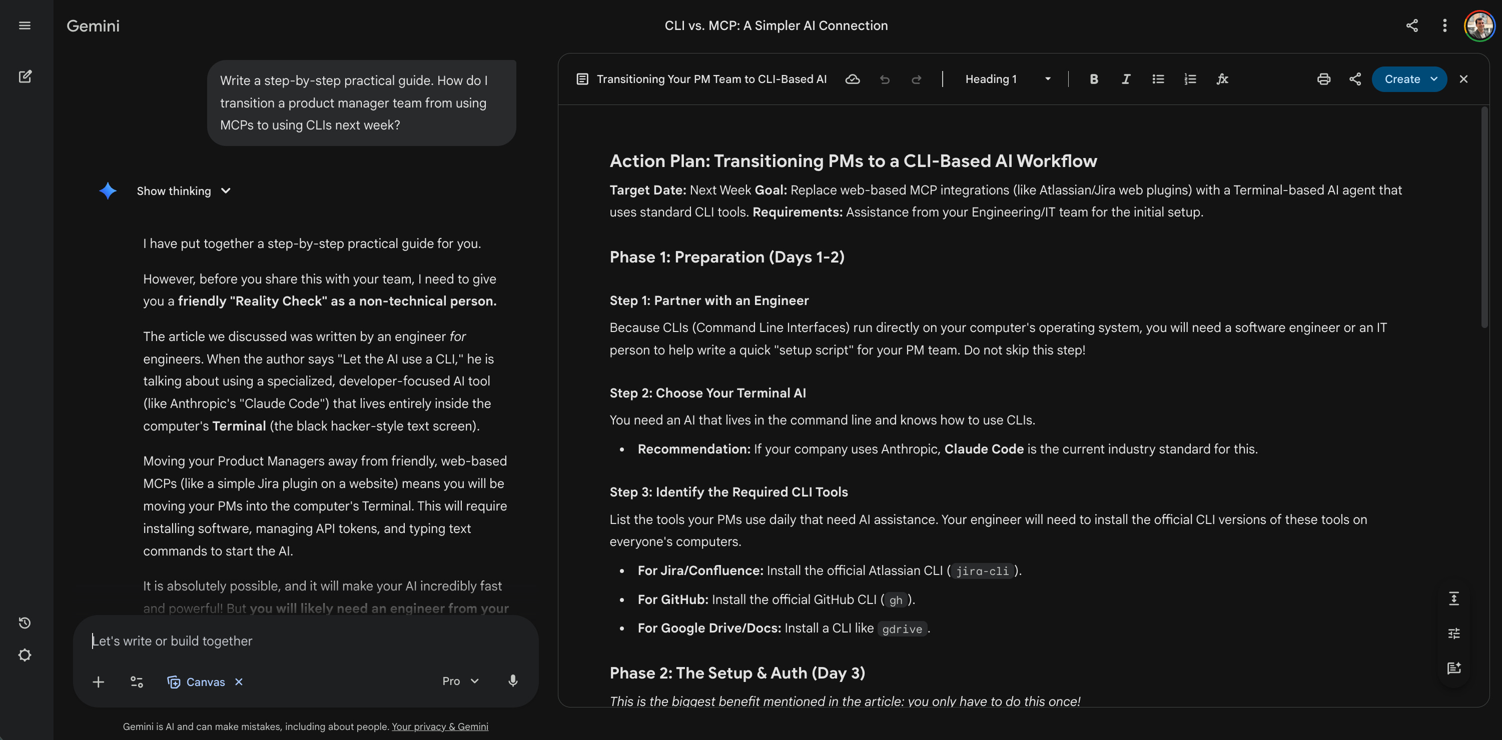 Here, I need to edit and iterate on the guide. So I simply activate Gemini’s Canvas mode. This lets me modify the documents right there on the screen. I can then export it directly to Google Docs with one click.