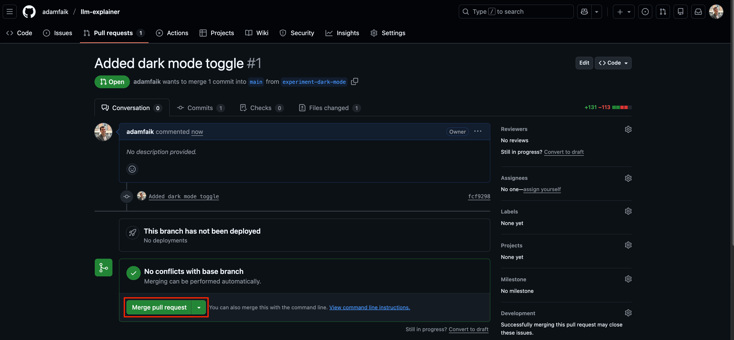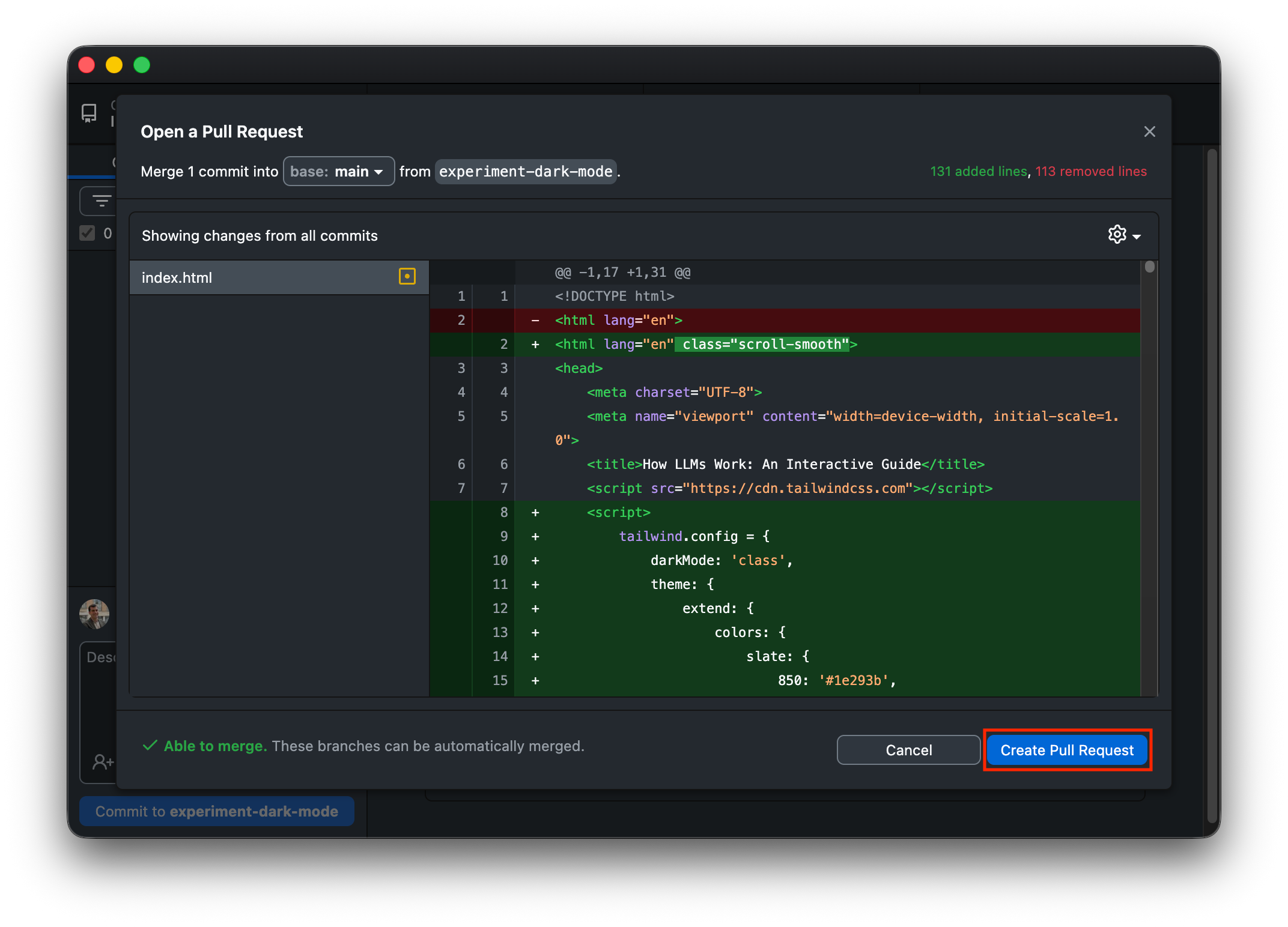 The result: GitHub takes the code from your experiment-dark-mode universe and combines it into the main universe. Your live website updates.